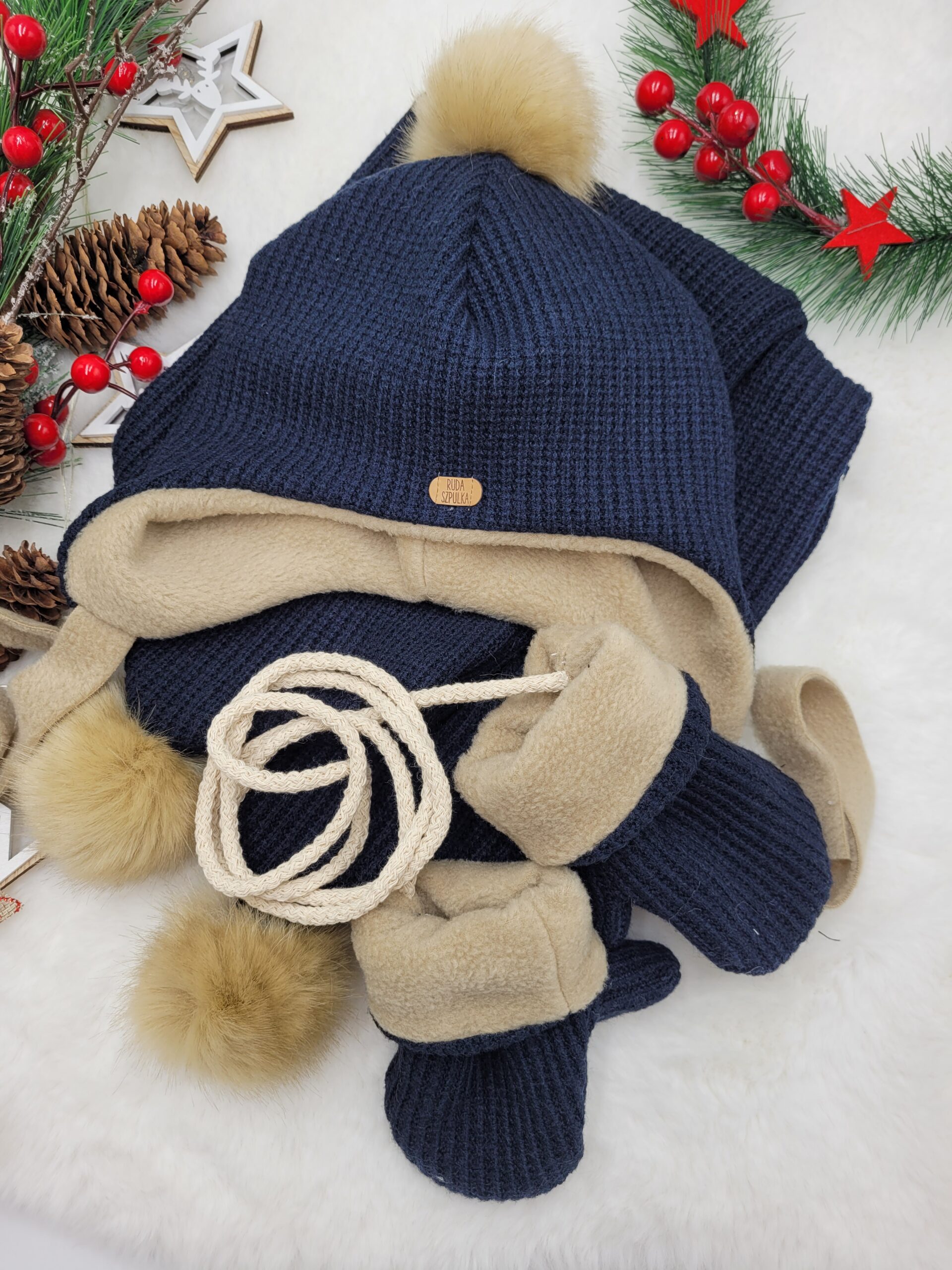 Komplet zimowy wiązany z pomponami – styl i ciepło na zimowe dni