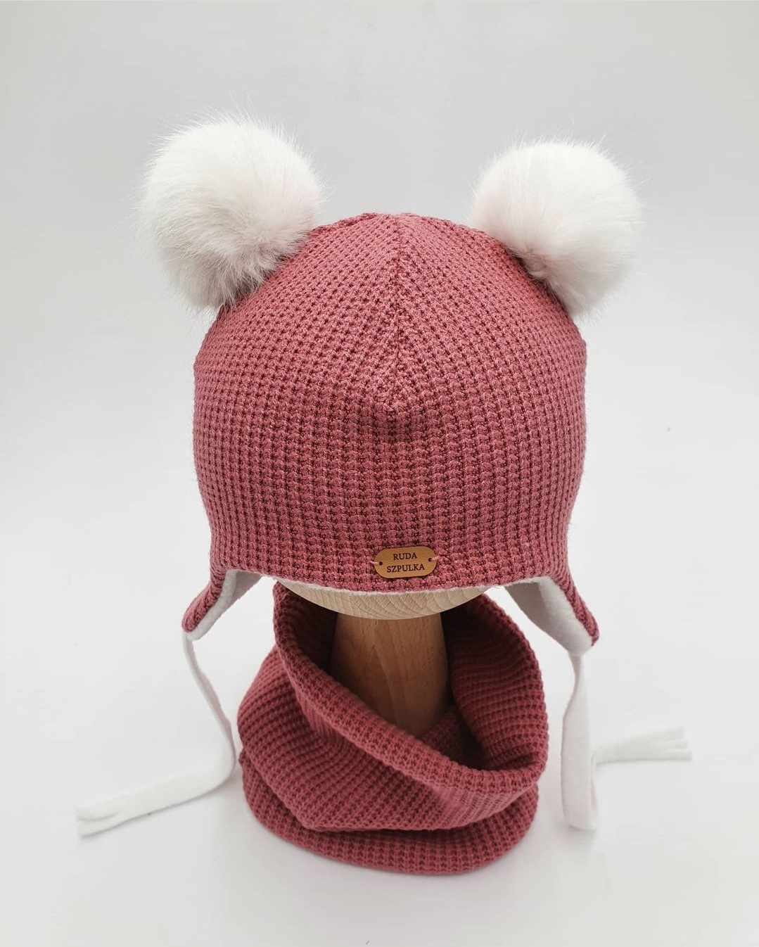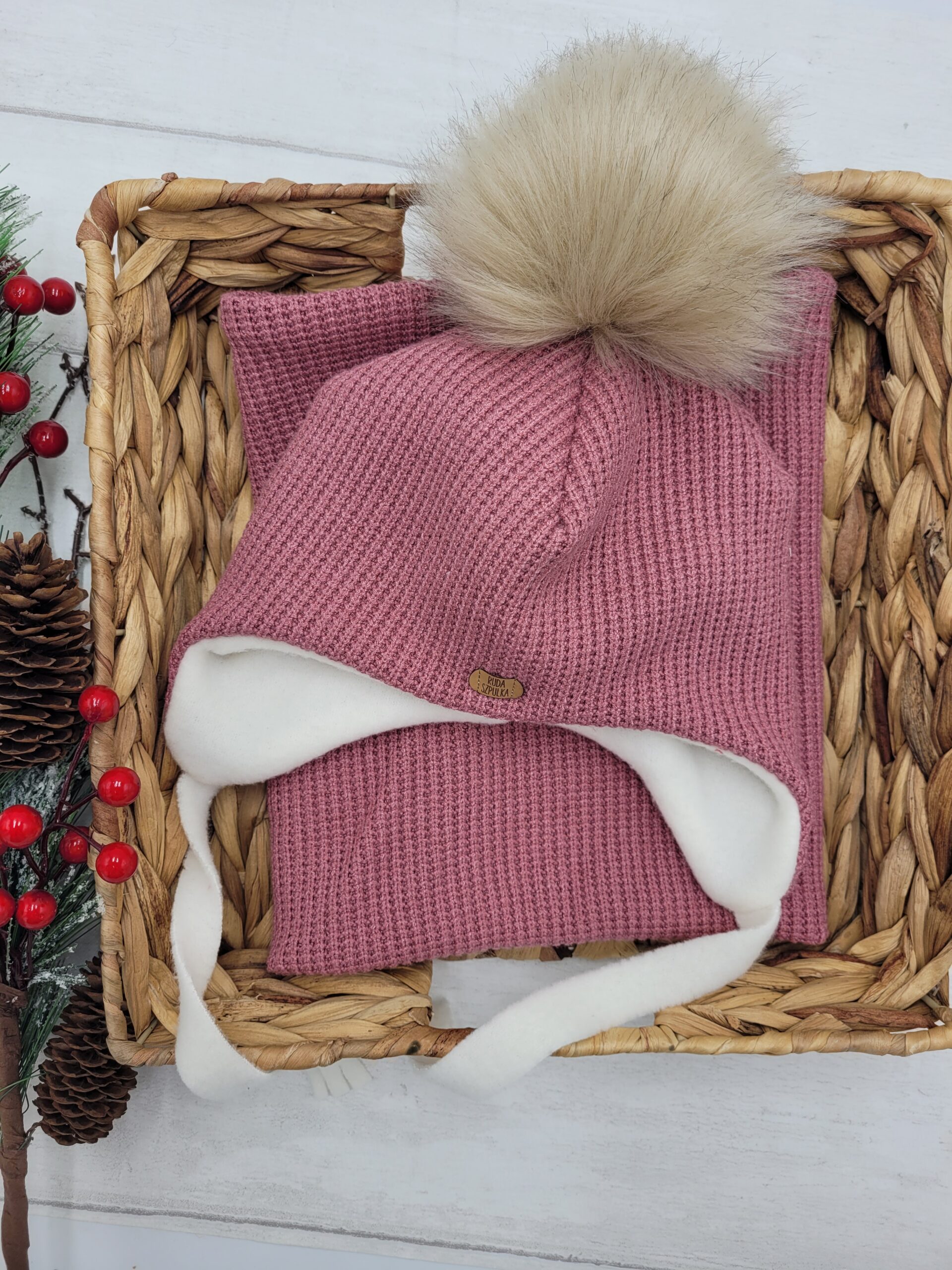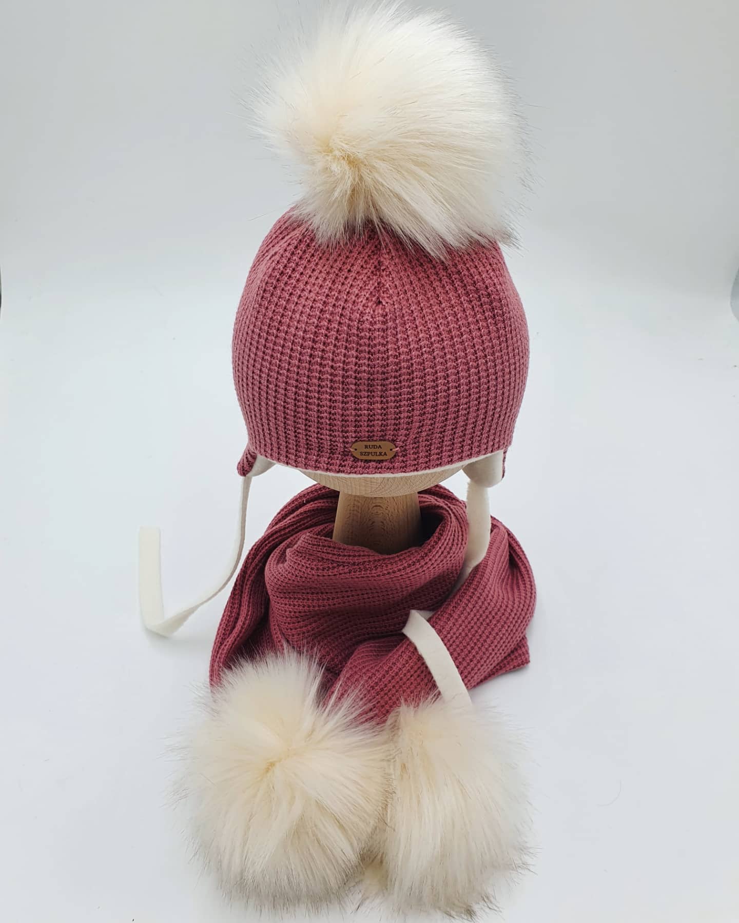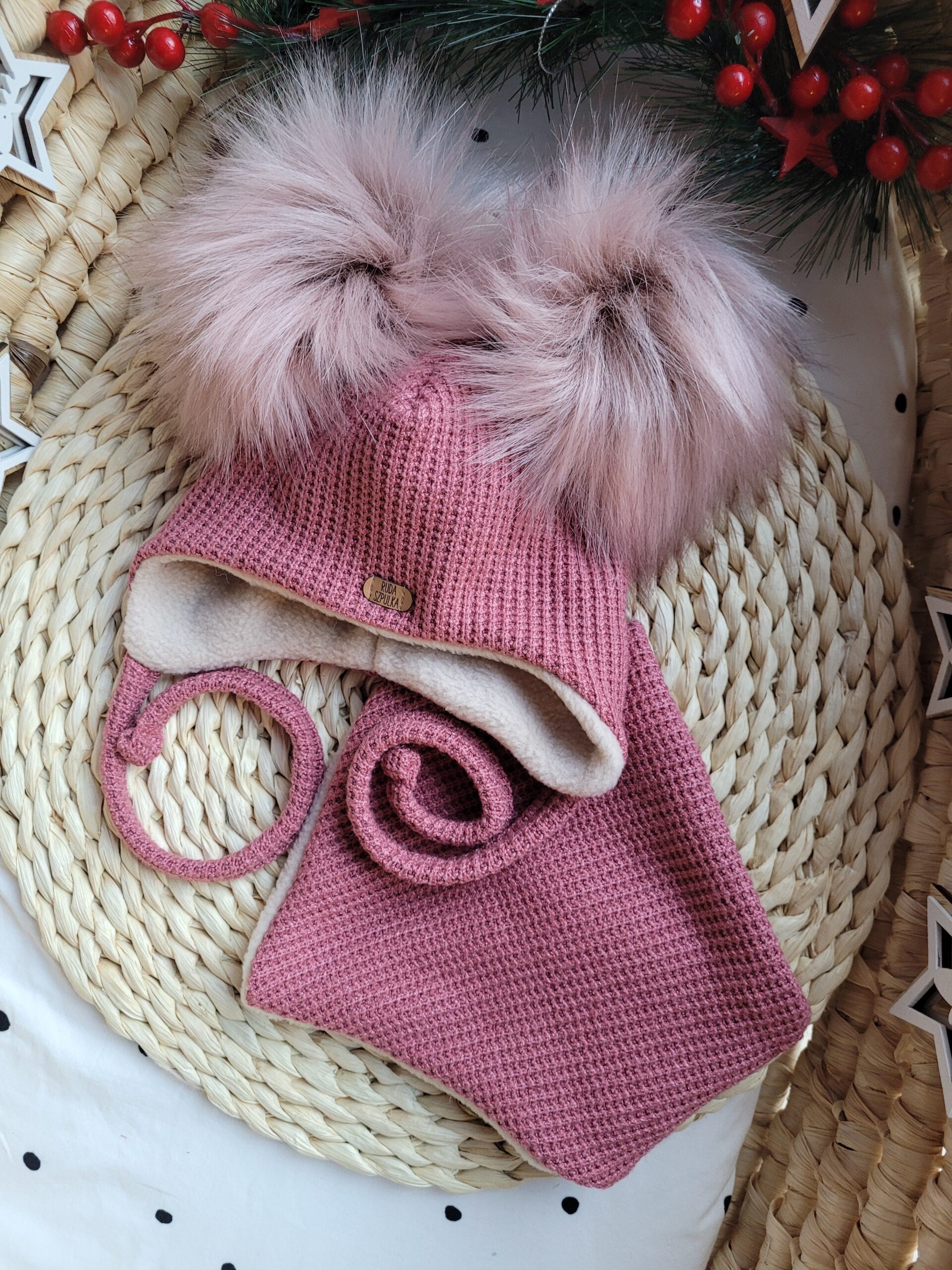 Zapewnij swojemu dziecku nie tylko ciepło, ale także wyjątkowy styl dzięki zimowemu kompletowi wiązanemu z pomponami. Wykonany z miękkiej dzianiny sweterkowej w kolorze róż wrzosowy, to idealny wybór dla dziewczynek.