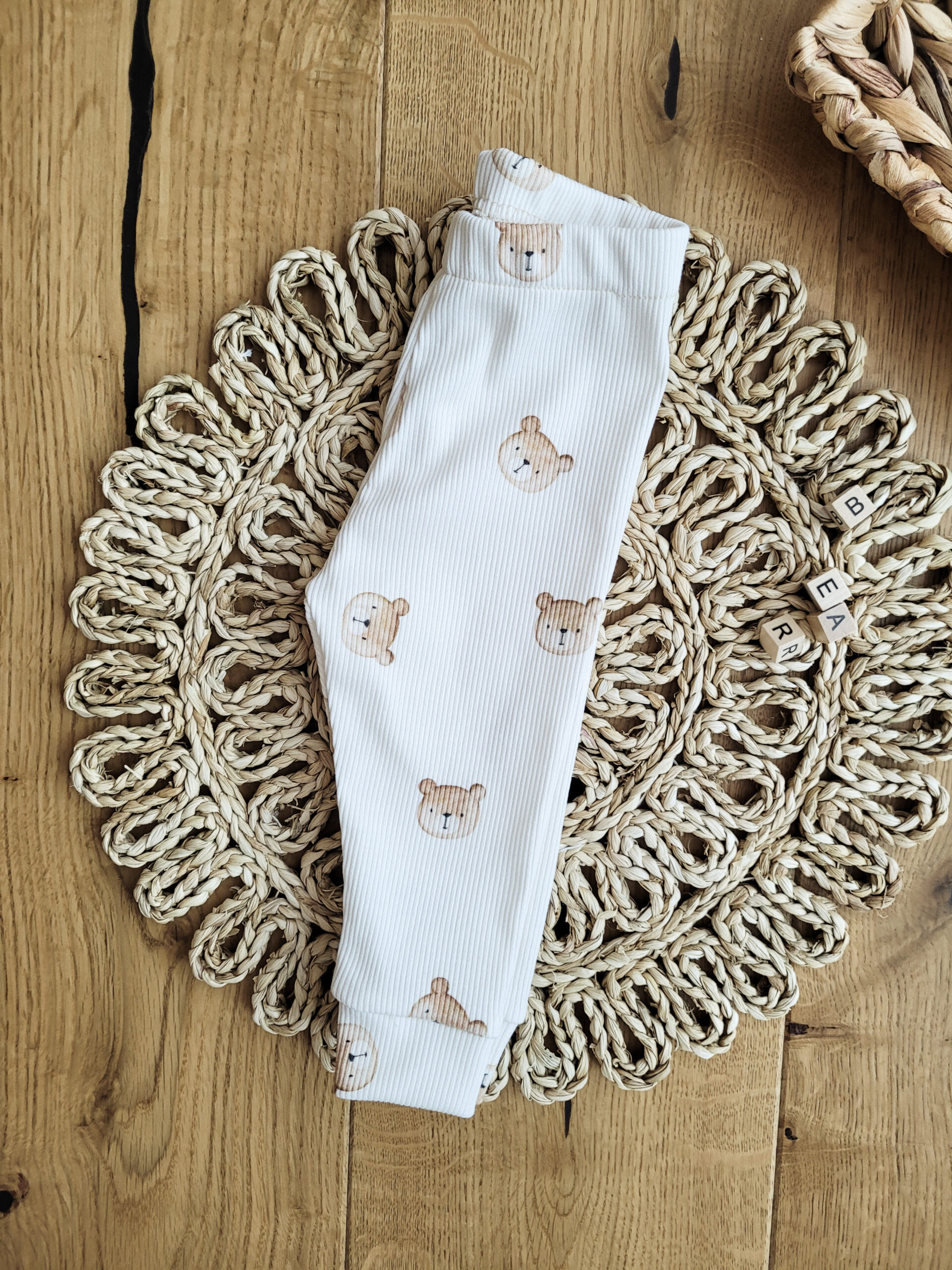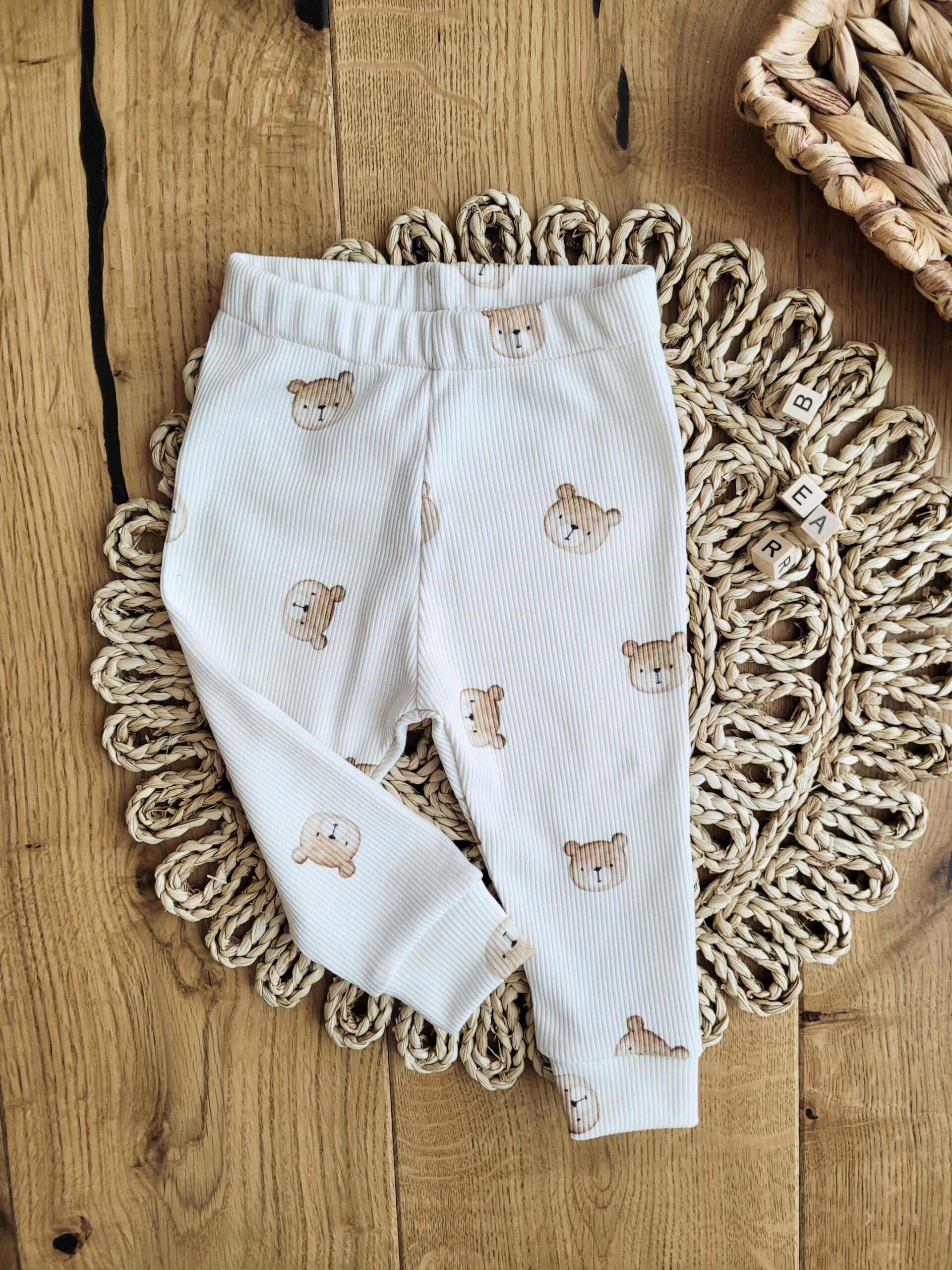 Legginsy dla dzieci i niemowląt prążkowane z misiowymi główkami.