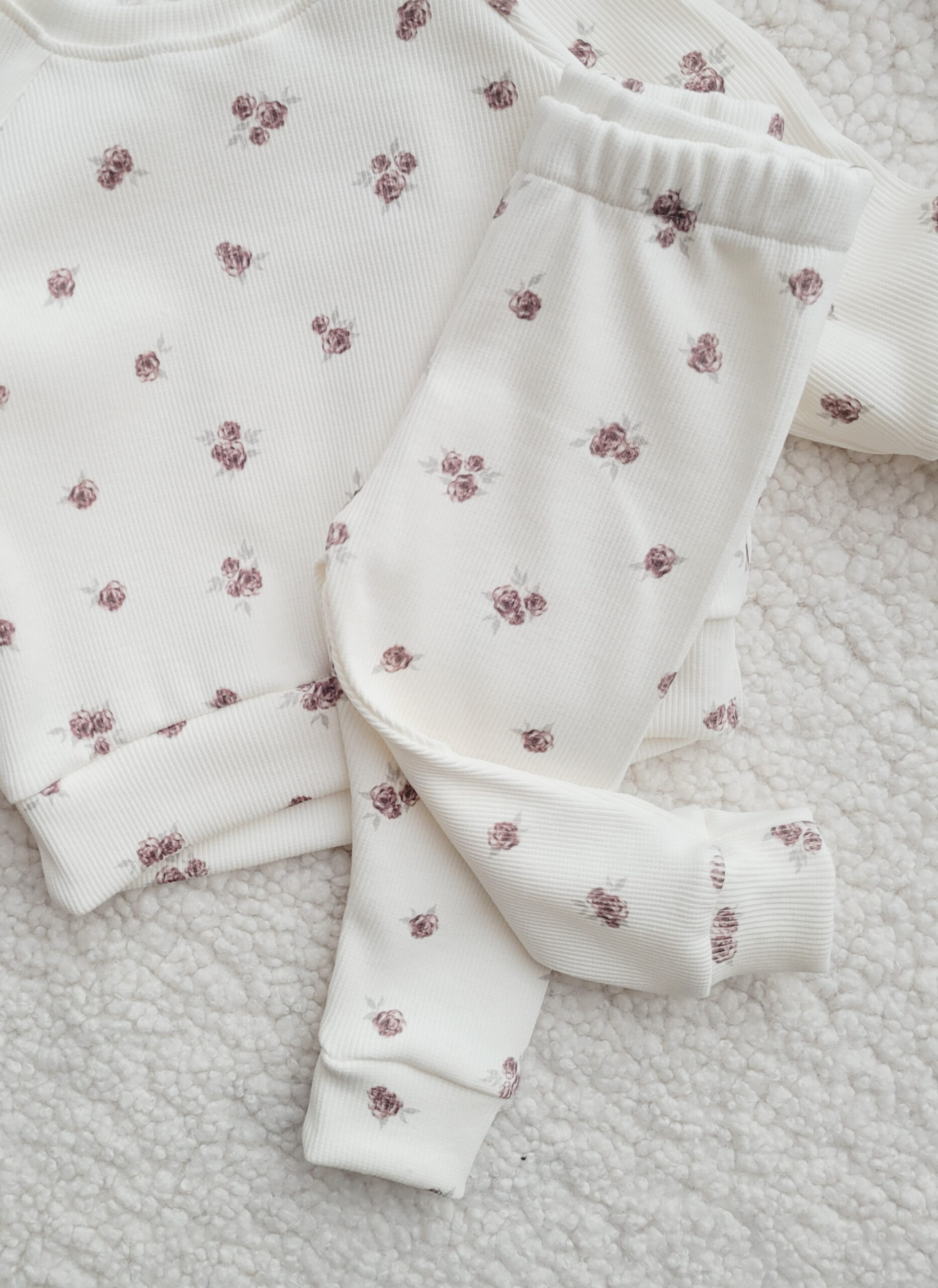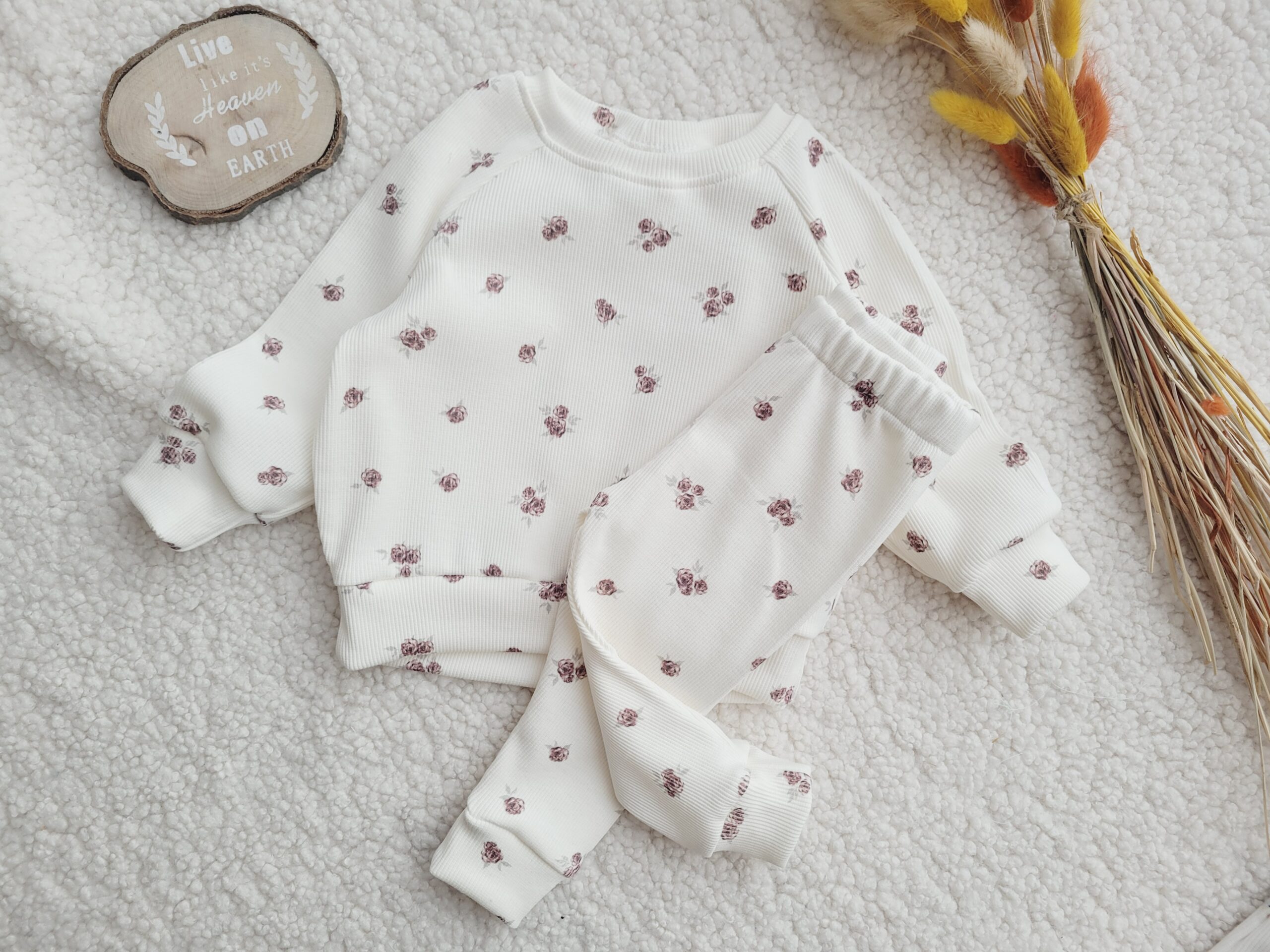 Legginsy dla dziewczynki uszyte z dzianiny prążkowanej premium, kolor śmietanka ozdobiony delikatnymi różyczkami. Dół został wykończony wygodnymi ściągaczami, w pasie wszyta bezuciskowa gumka. Legginsy będą pięknie wyglądać na niemowlęciu jak i na przedszkolaku. Do kompletu możesz zamówić pasującą czapkę, opaskę czy chustkę pod szyję.