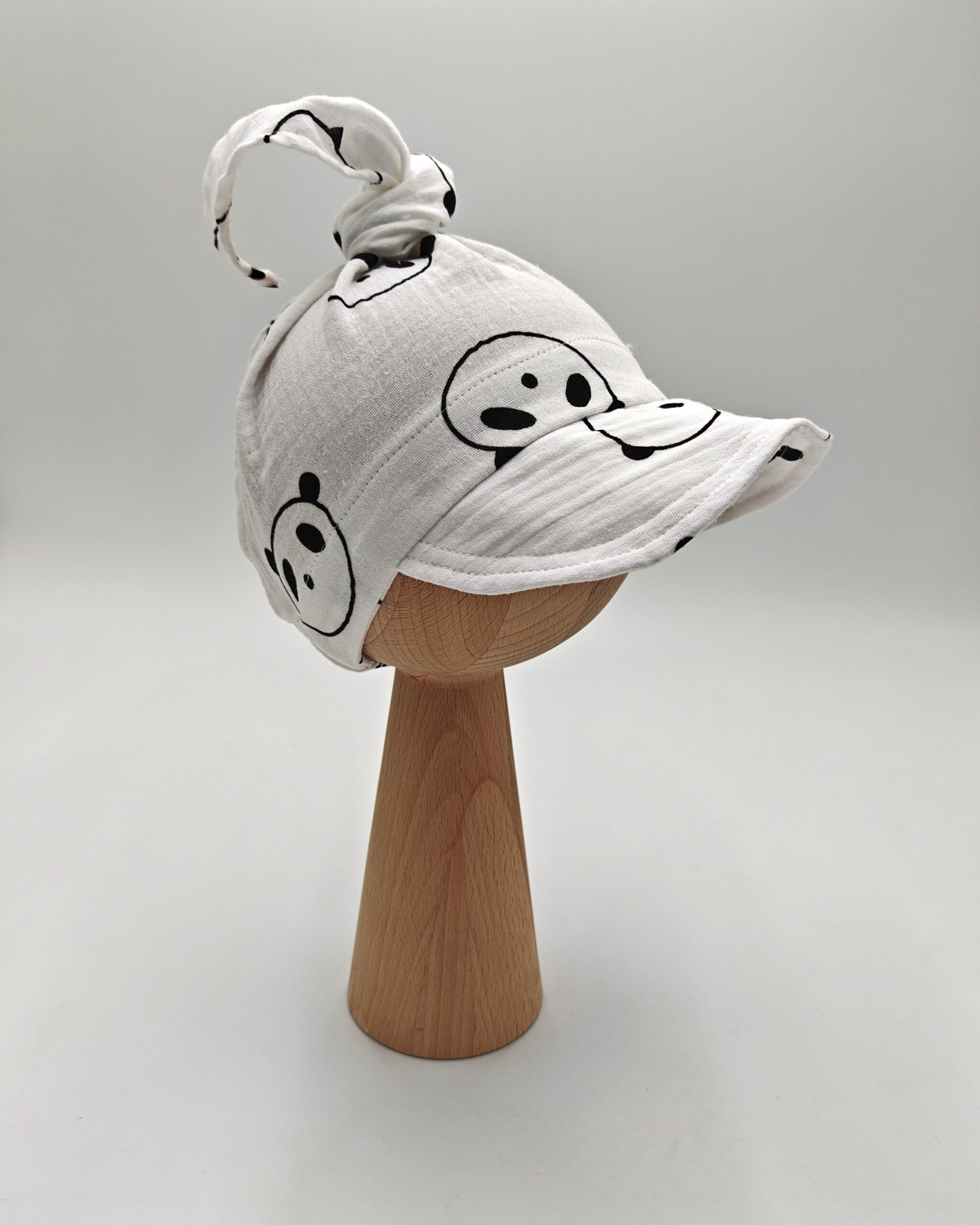 Chustka z daszkiem dla chłopca we wzór Pand. Uszyta z muślinu bawełnianego z certyfikatem Oeko-Tex. Lekka, przewiewna i wygodna – idealna na lato!