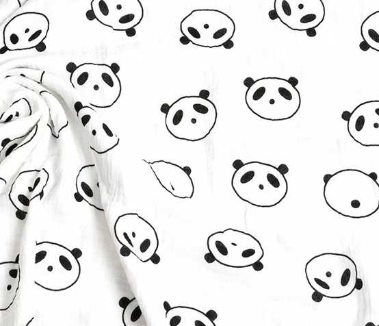 Uszyliśmy tę chustkę z daszkiem z najwyższej jakości muślinu bawełnianego w kolorze białym, ozdobionego subtelnym wzorem pand. To idealny wybór na ciepłe dni – chustka jest przewiewna, lekka i delikatna dla skóry dzieci i niemowląt.