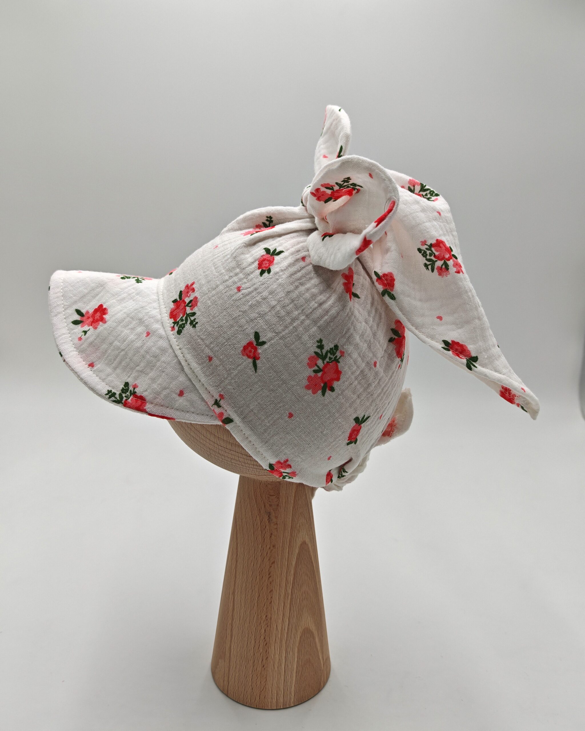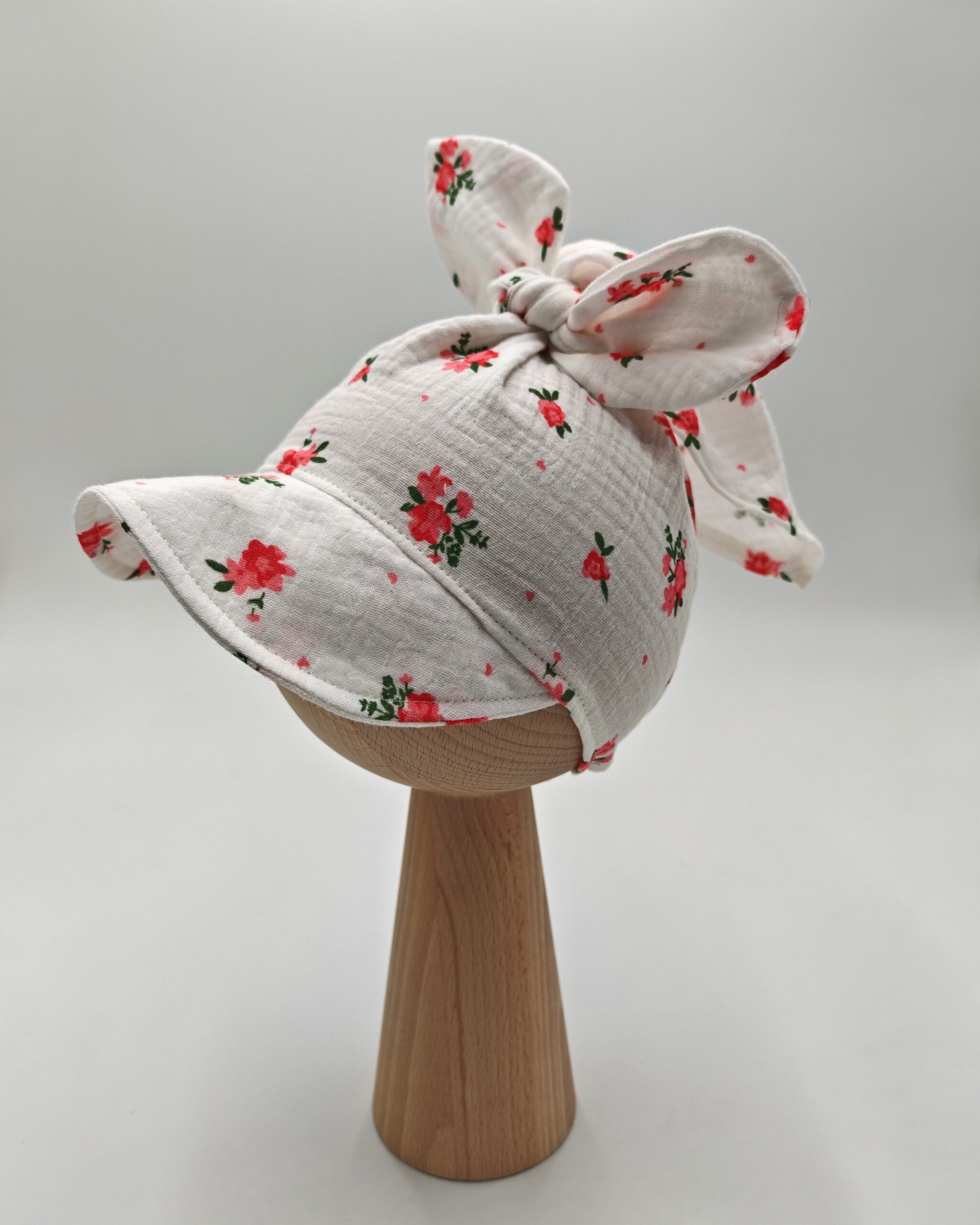 Chustka z daszkiem dla dziewczynki we wzór koralowych kwiatów. Uszyta z muślinu bawełnianego z certyfikatem Oeko-Tex. Lekka, przewiewna i wygodna – idealna na lato!