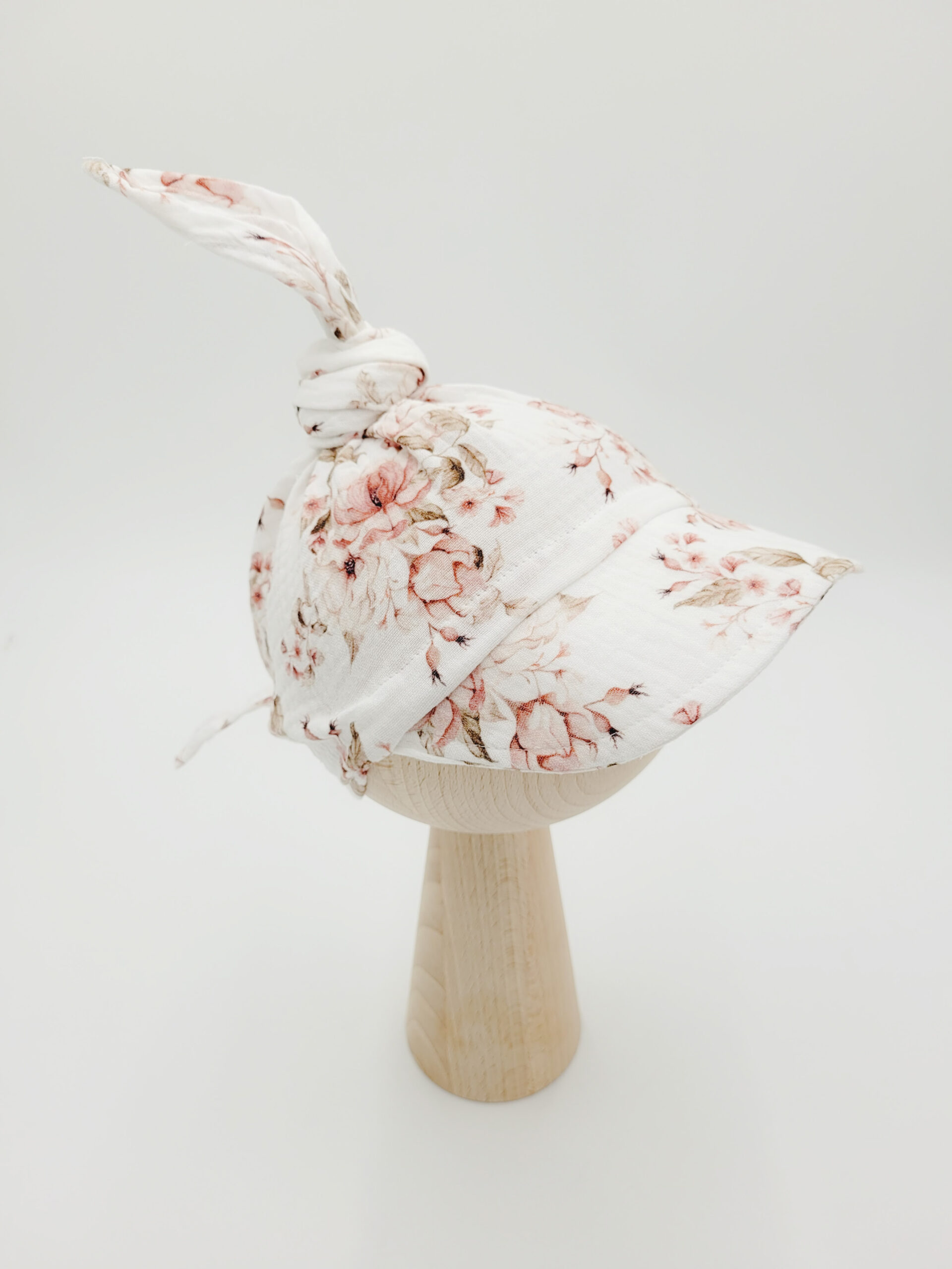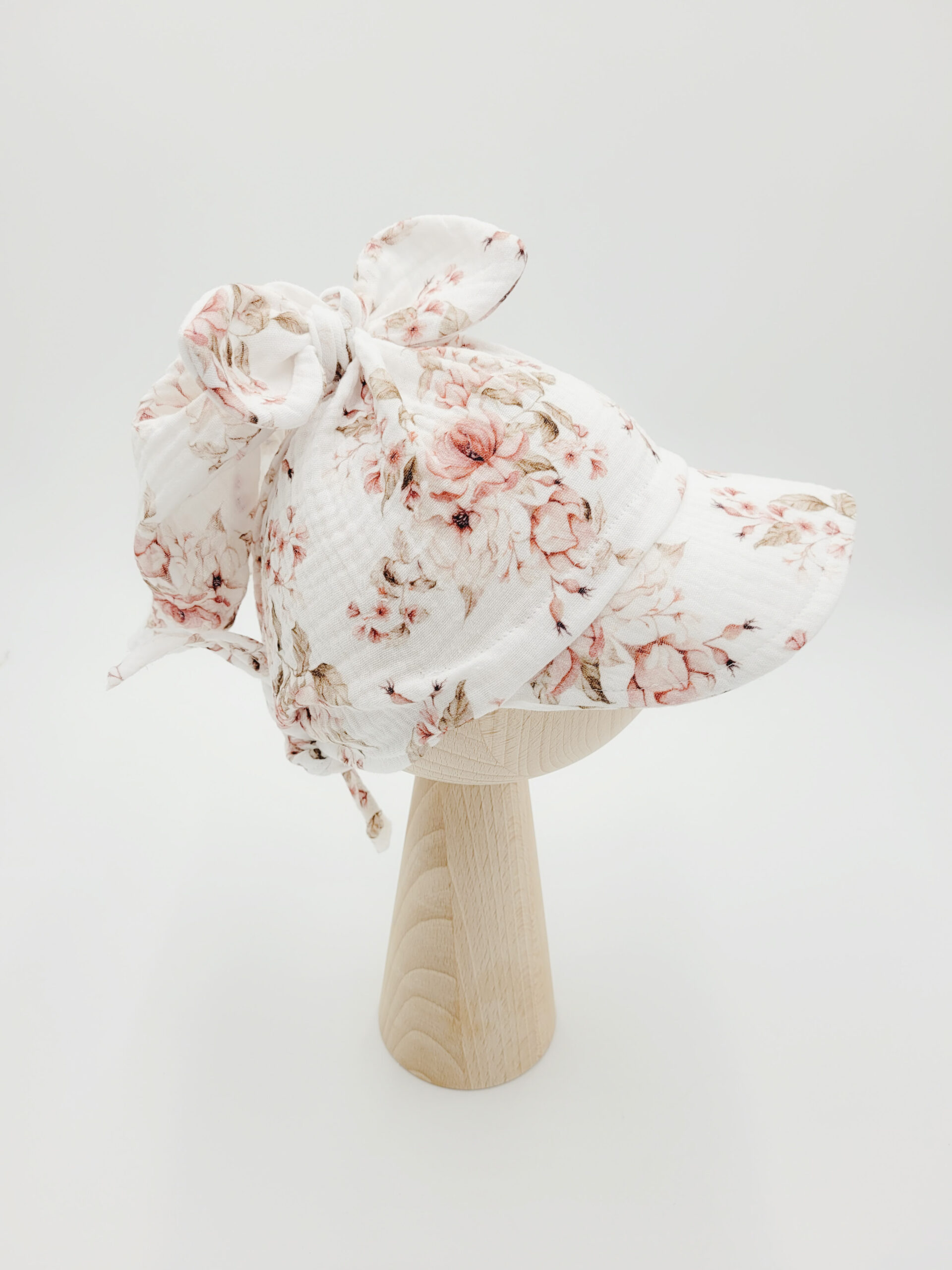 Chusta z daszkiem dla dziewczynki przewiązana kokardką uszyta z muślinu bawełnianego wzór rosie biel – wiązana lub na gumce.