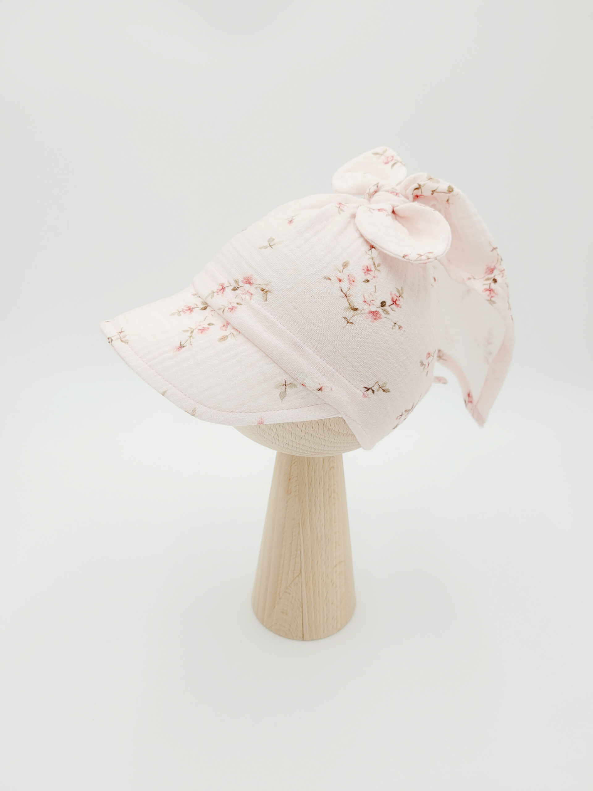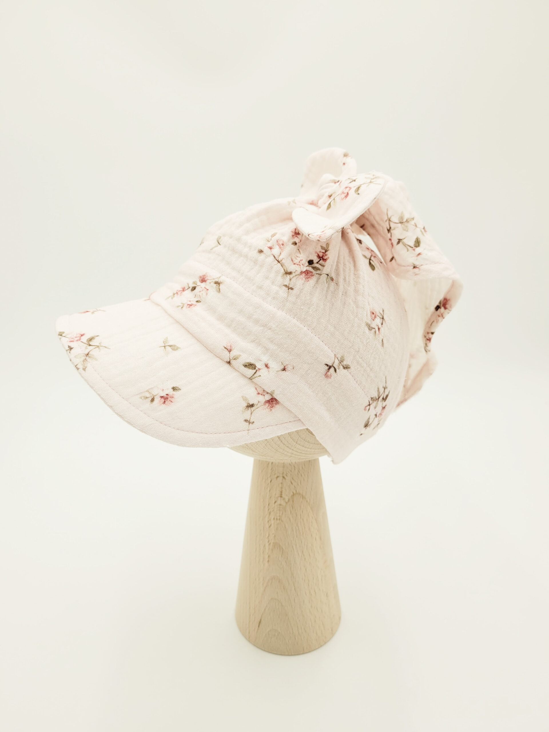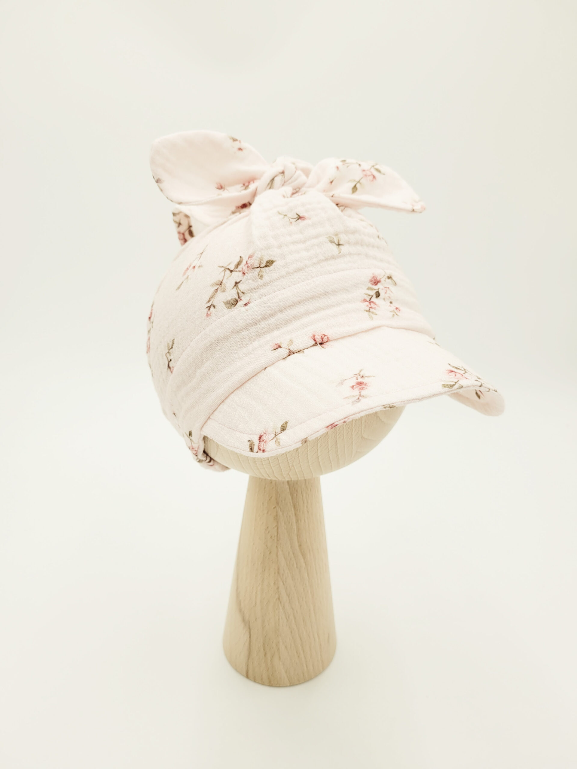 Chustka z daszkiem dla dziewczynki uszyta z wysokiej jakości muślinu bawełnianego w kolorze różowym z delikatnym wzorem różyczki. Chustka przewiązana jest kokardką, ale można również wiązać supełek. Rozmiary pasują na dzieci i niemowlęta.