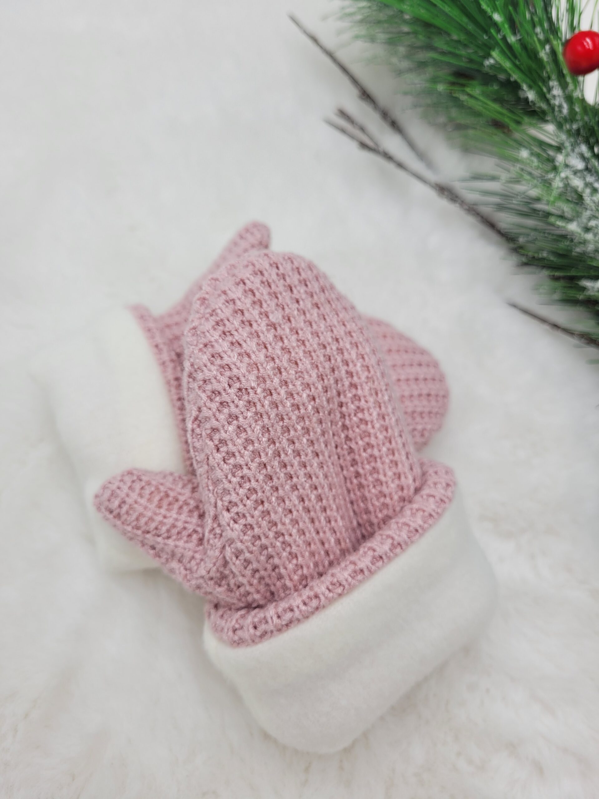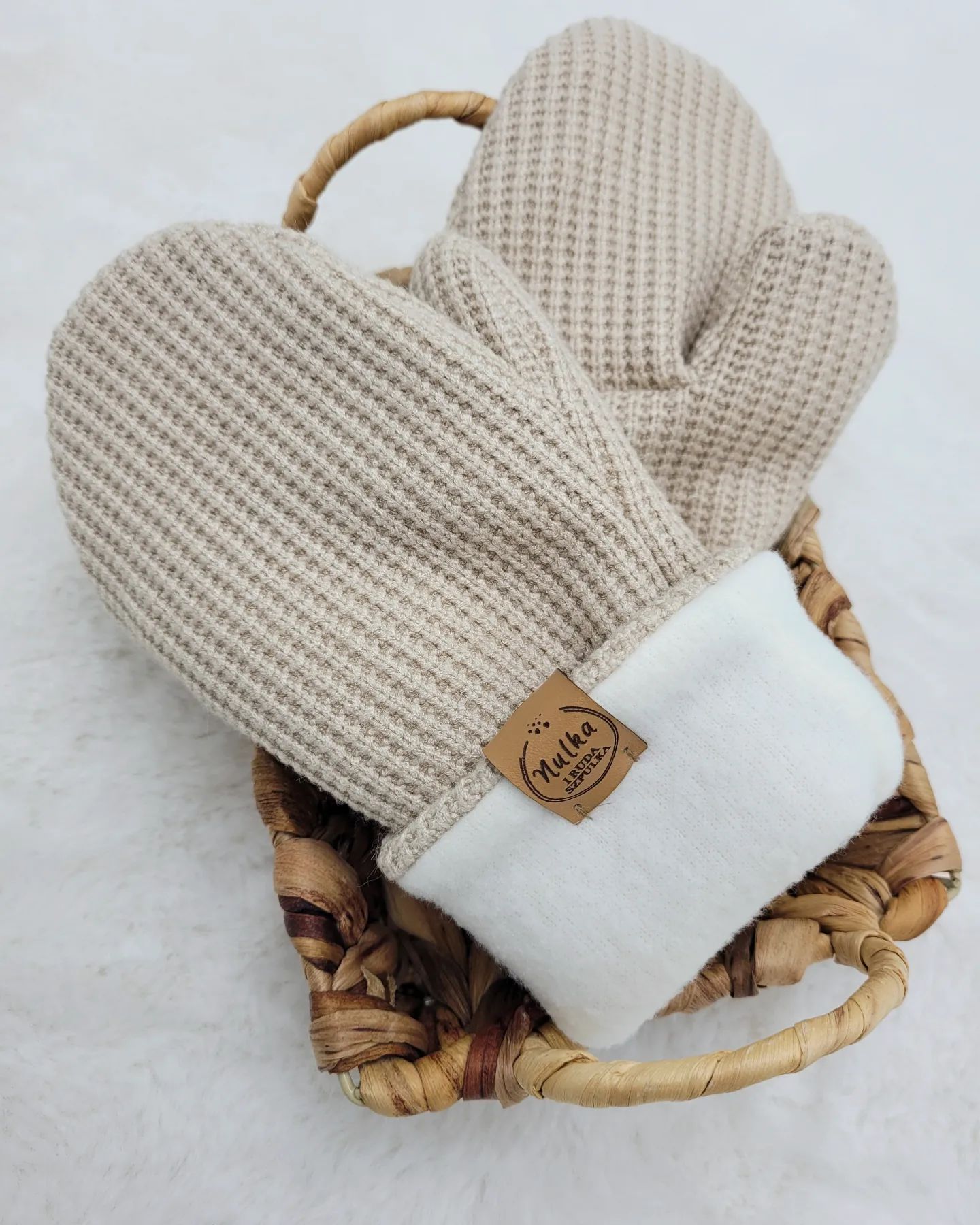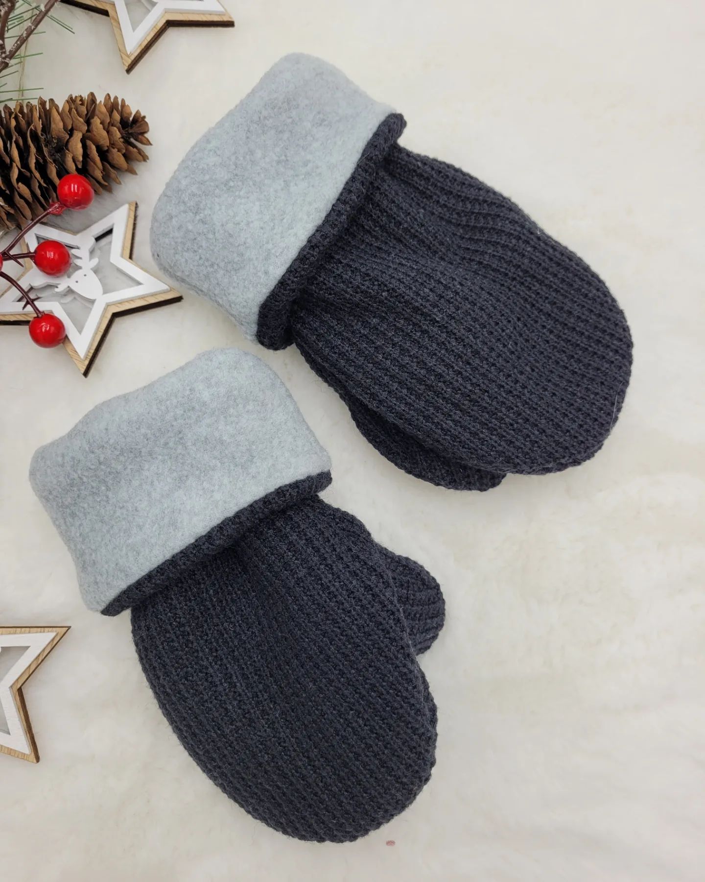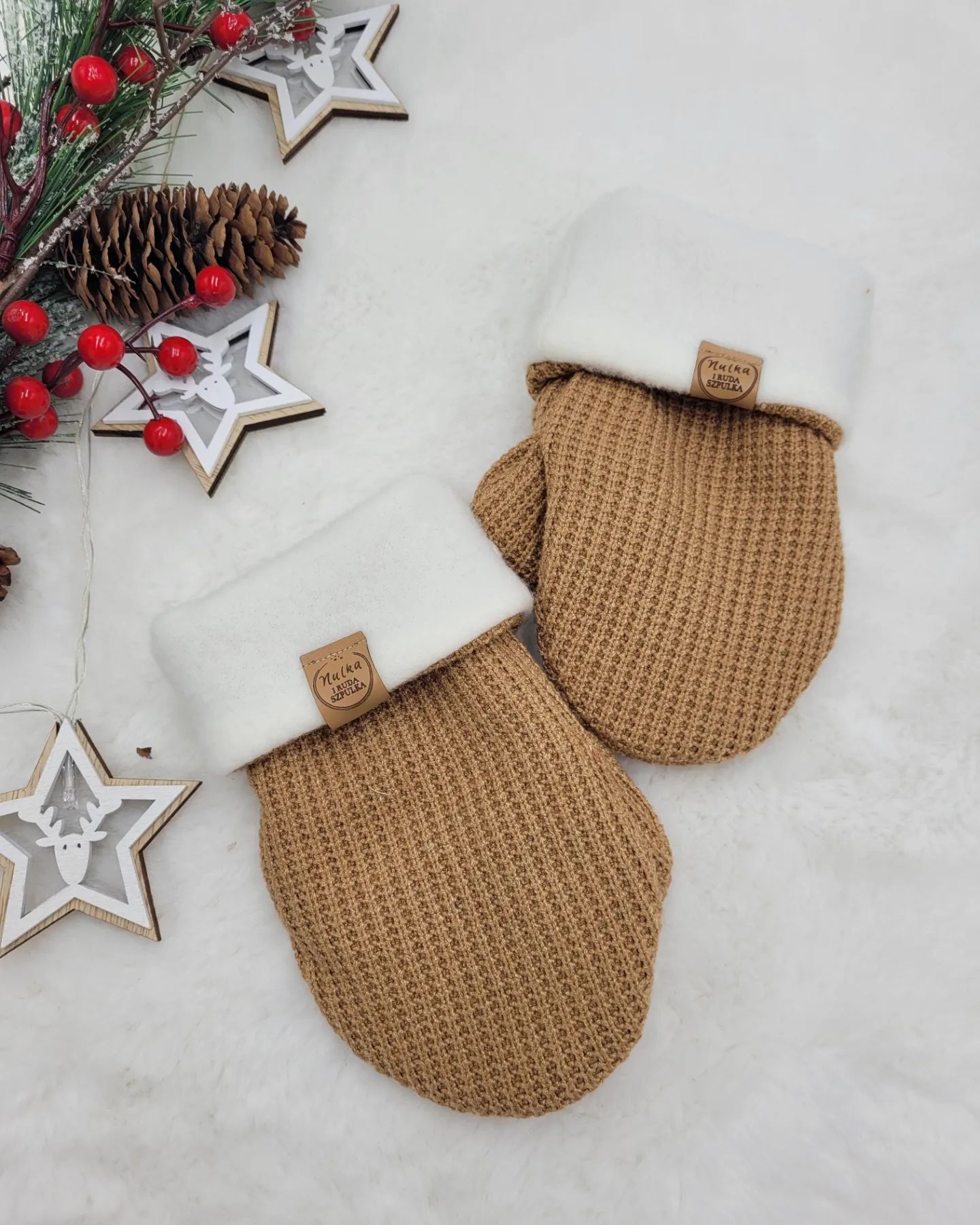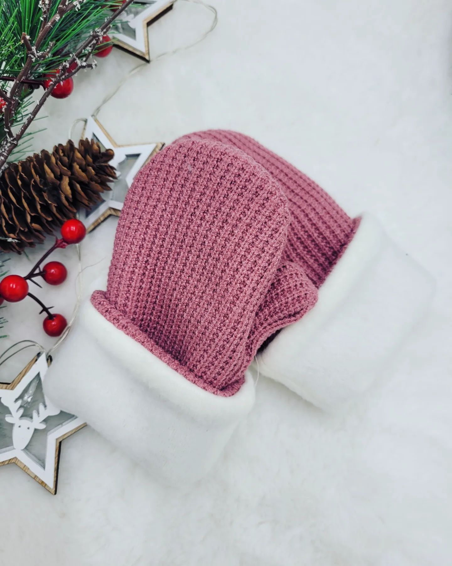 Dzianina sweterkowa prezentuje się elegancko, a miękki polar wewnątrz doskonale zatrzymuje ciepło. Materiały są przyjemne w dotyku, nie gryzą i nie podrażniają skóry, dzięki czemu rękawiczki są idealne na codzienne spacery i zimowe zabawy.