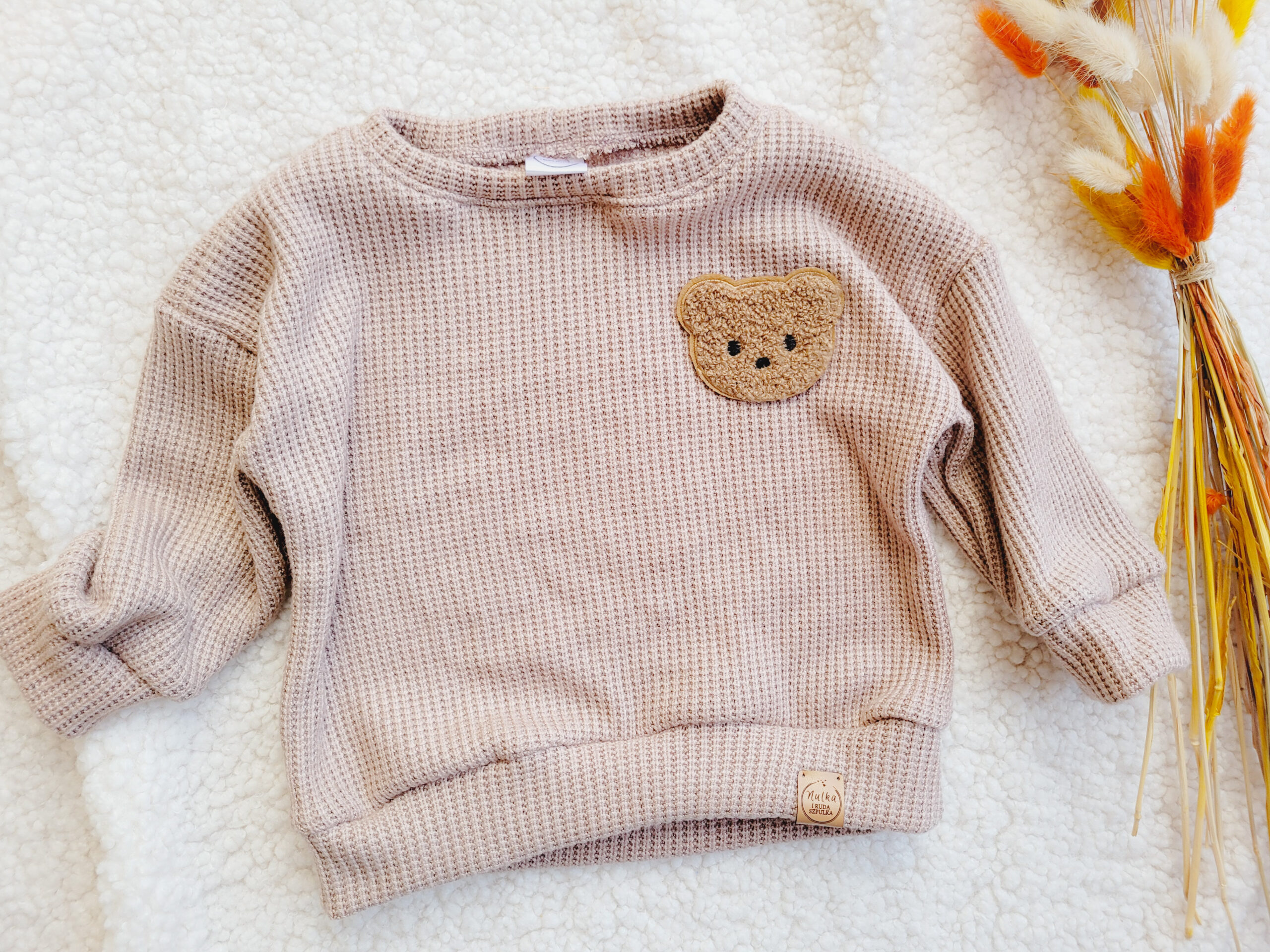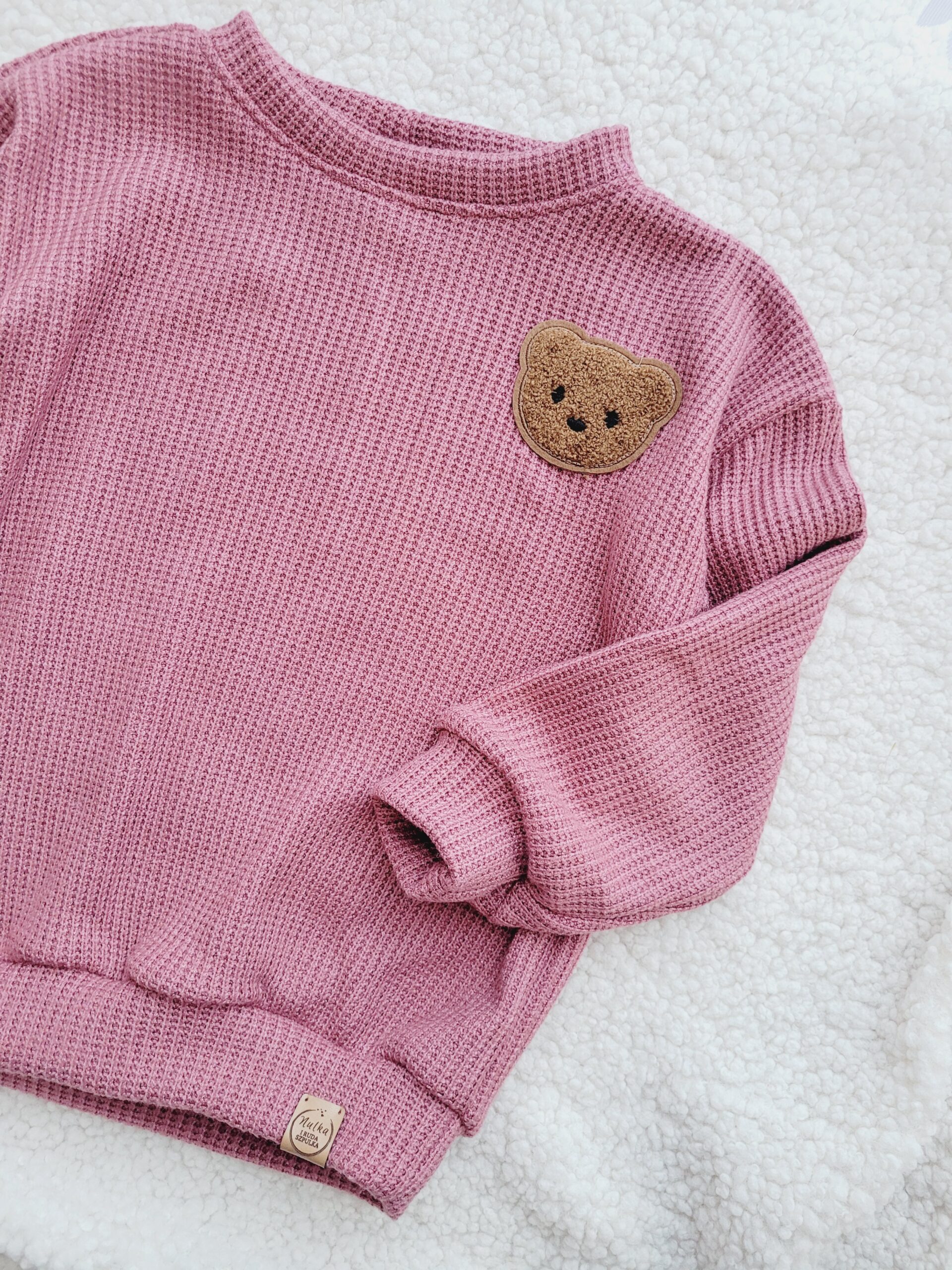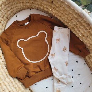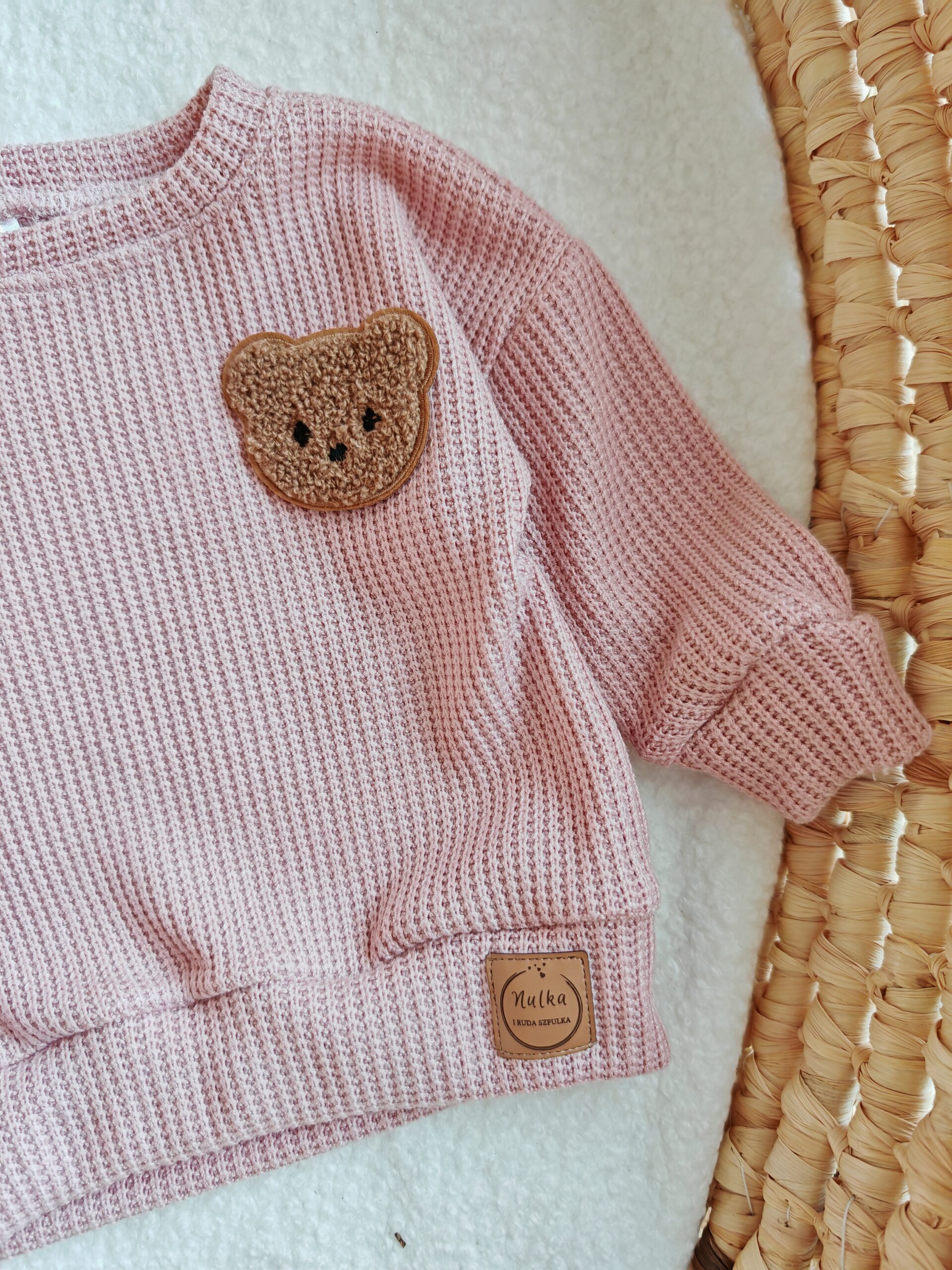 Sweterek dostępny jest w pięknych kolorach, które można dowolnie łączyć ze sweterkowymi spodniami czy legginsami. Z naszywką misia szyjemy również bluzy dresowe i prążkowane a także czapki.