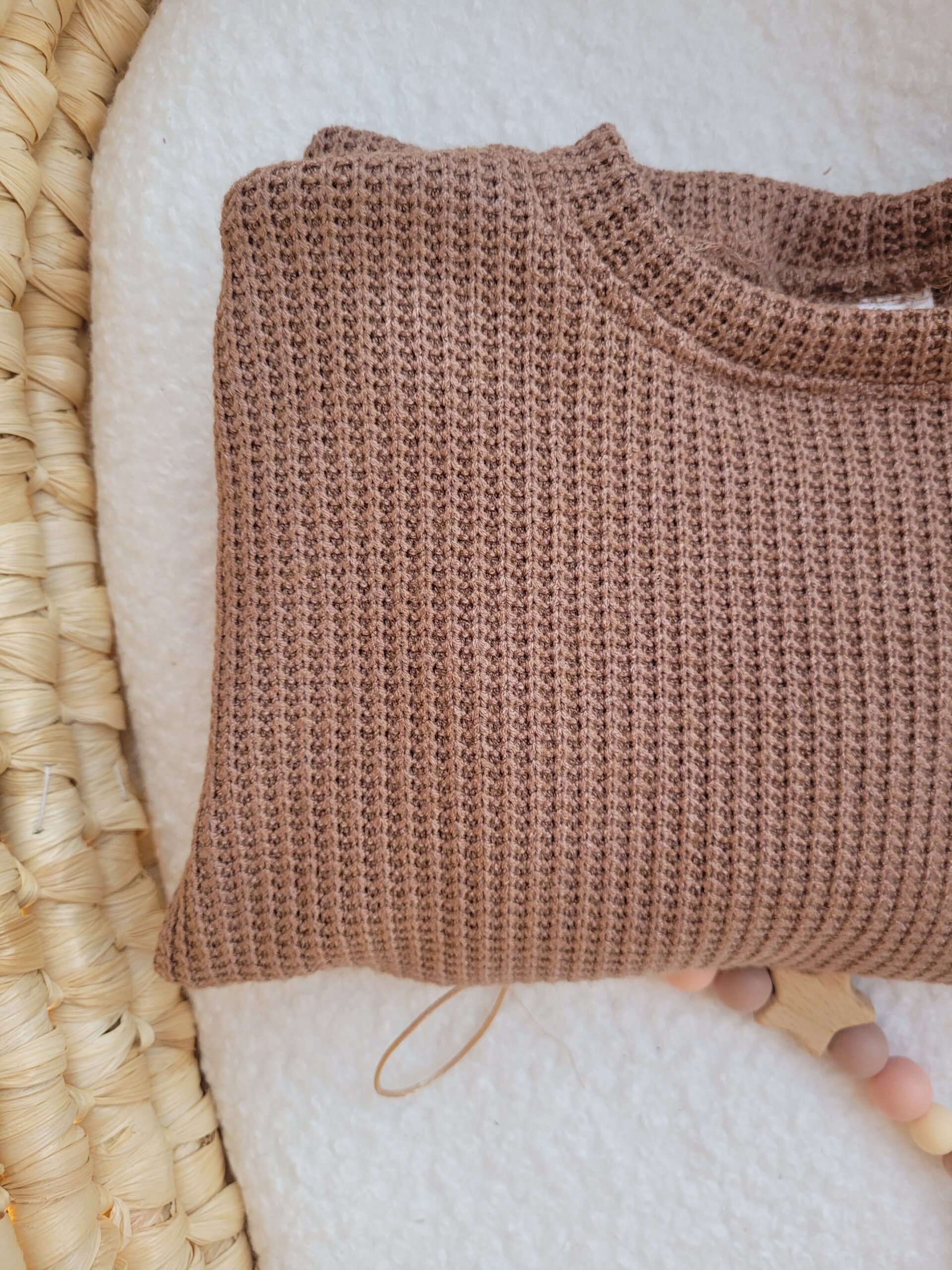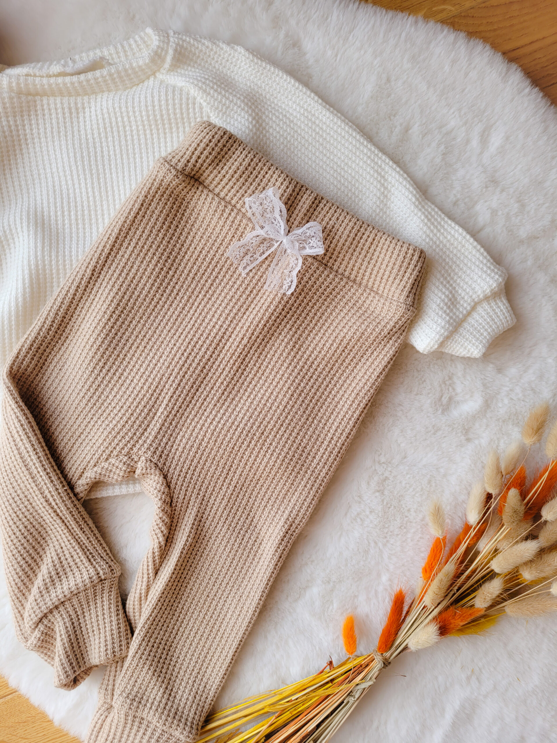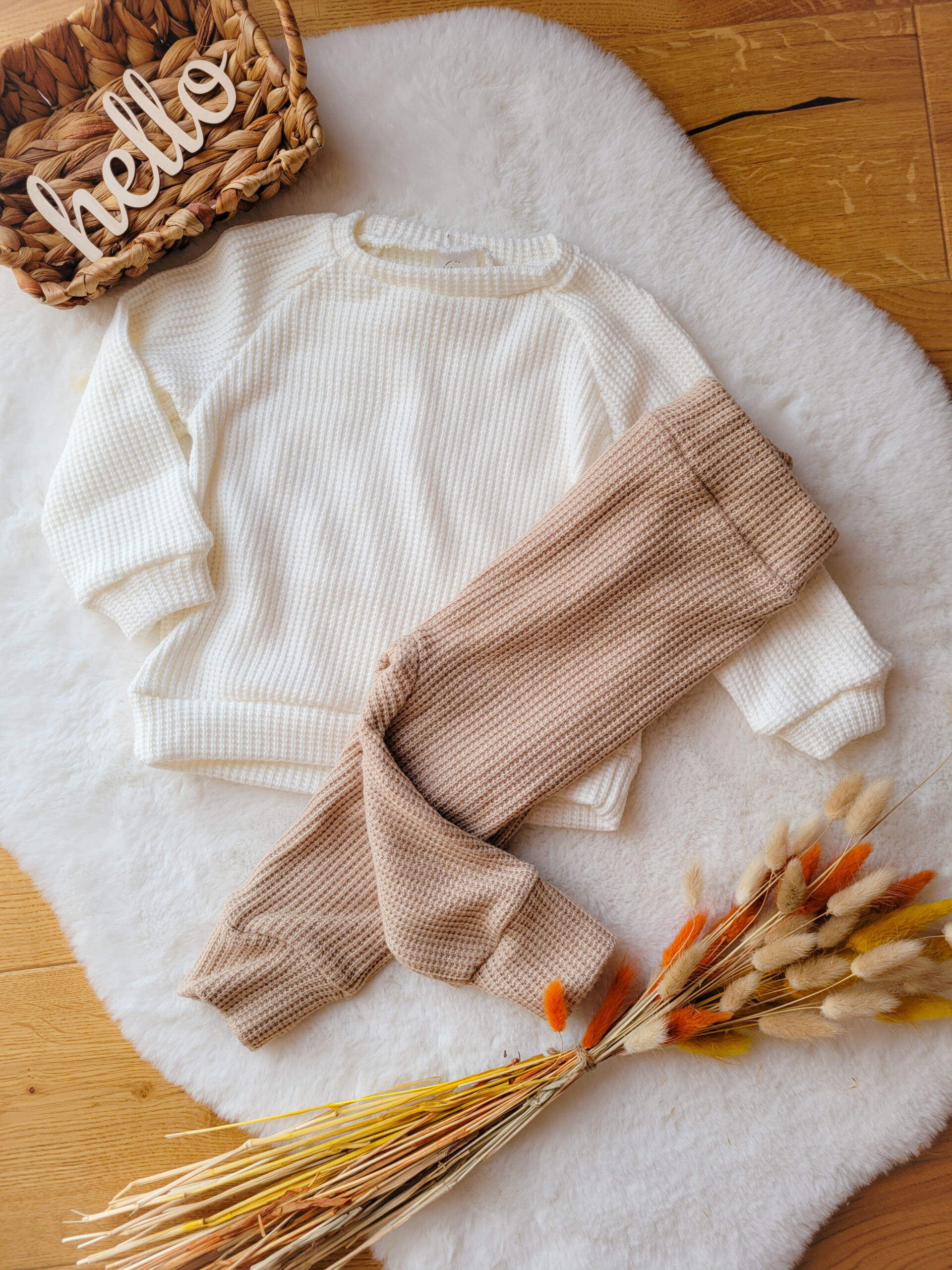 Przepiękny komplet dla chłopca lub dziewczynki uszyty z miękkiej dzianiny sweterkowej to idealna propozycja na każdą porę roku. Sweterek, który łatwo nakłada się przez głowę, oraz spodnie dresowe, tworzą stylowy zestaw, który jest wygodny nawet dla niemowląt. Delikatne, stonowane kolory dodają uroku i sprawiają, że komplet będzie ozdobą wielu stylizacji i okazji.