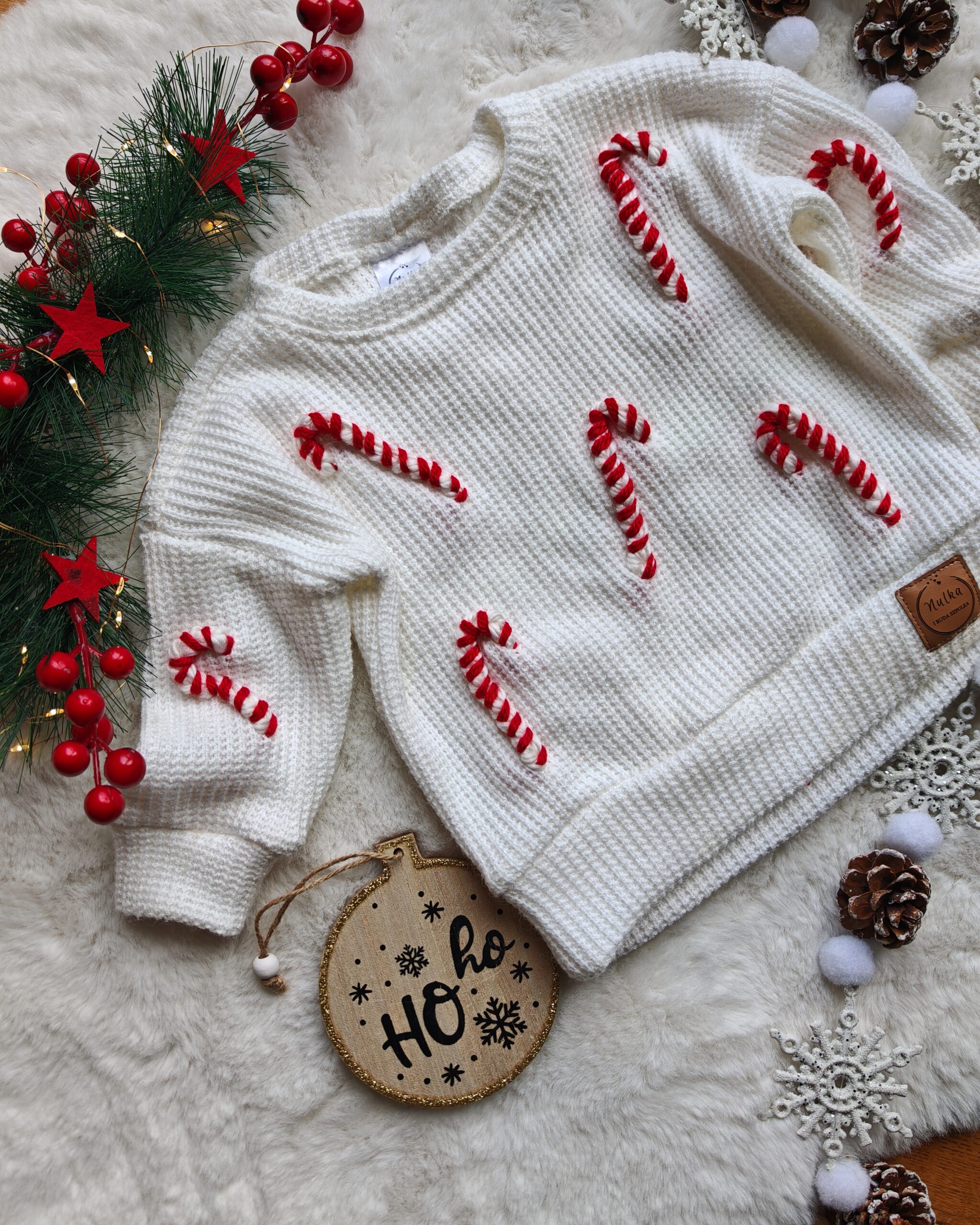 Do sweterka z haftowanymi laskami cukrowymi można dobrać pasujące czapki, kominy, chusty lub rękawiczki handmade w tych samych kolorach. Całość stworzy piękny, świąteczny zestaw idealny na prezent.