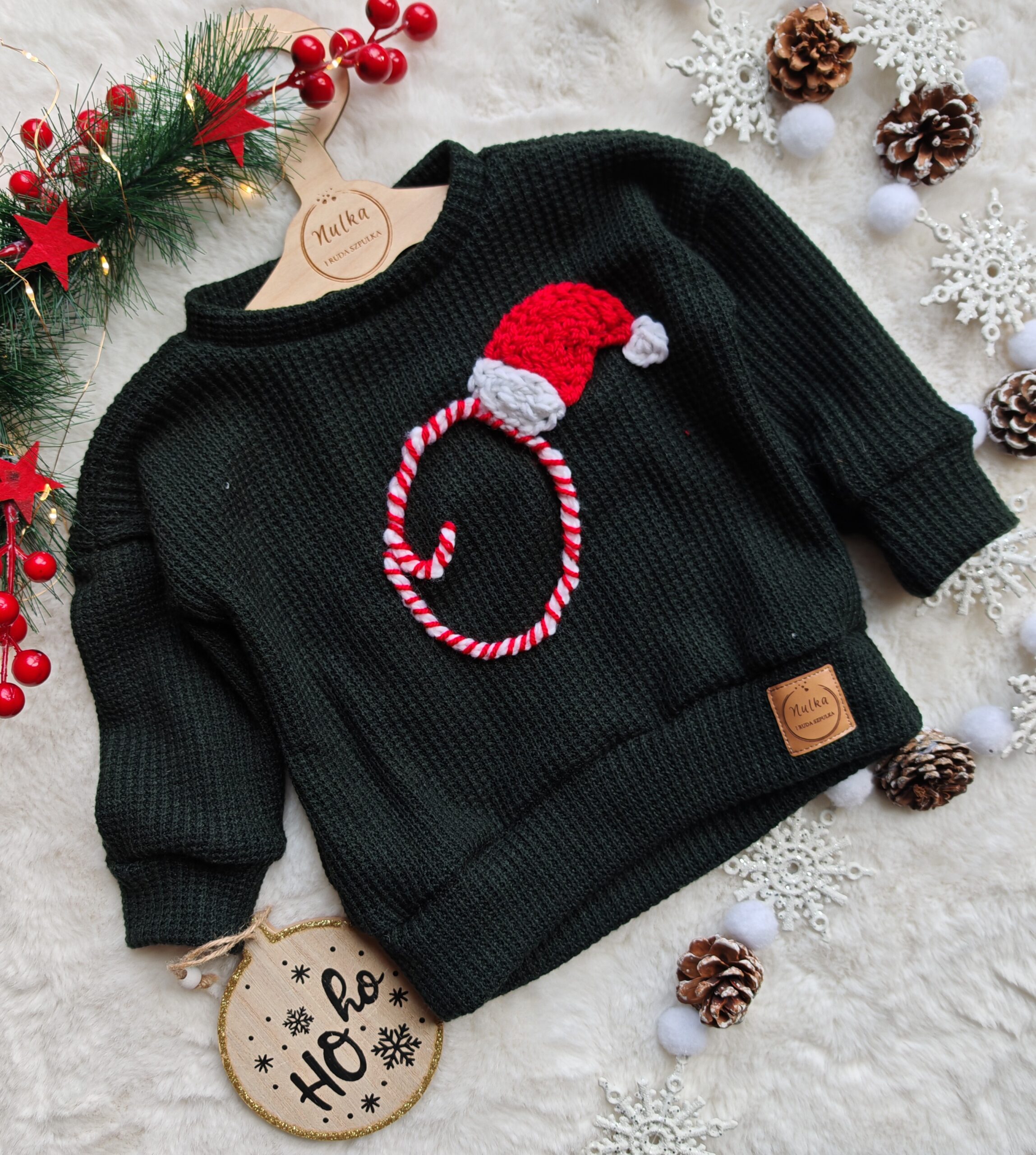 Każdy sweterek zdobi haftowana ręcznie literka imienia dziecka w kolorach czerwieni i bieli, inspirowana motywem lasek cukrowych. Dodatkowa ozdoba w postaci czapki Mikołaja sprawia, że sweterek staje się nie tylko ubraniem, ale także piękną, świąteczną pamiątką.