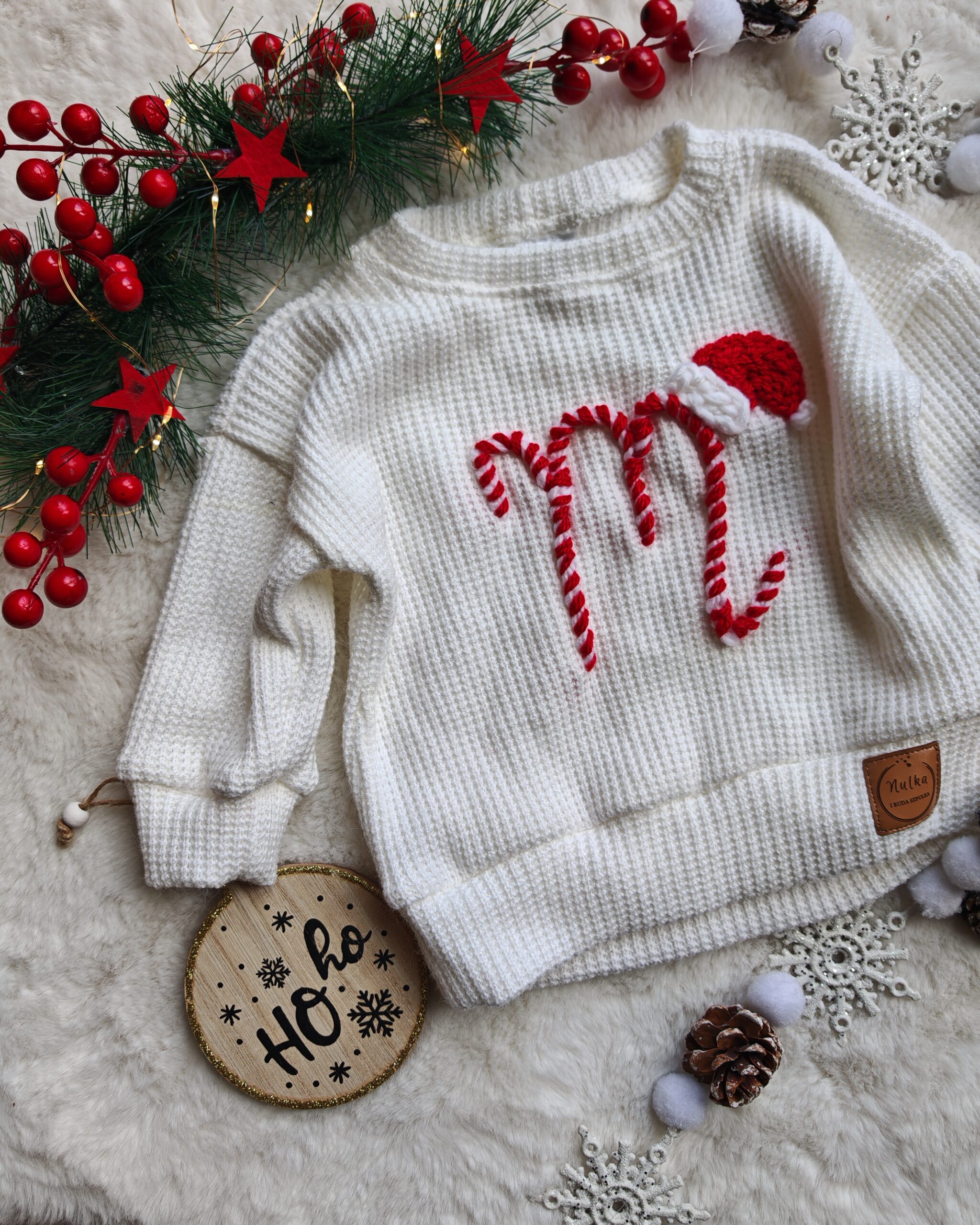 Każdy sweterek zdobi haftowana ręcznie literka imienia dziecka w kolorach czerwieni i bieli, inspirowana motywem lasek cukrowych. Dodatkowa ozdoba w postaci czapki Mikołaja sprawia, że sweterek staje się nie tylko ubraniem, ale także piękną, świąteczną pamiątką.