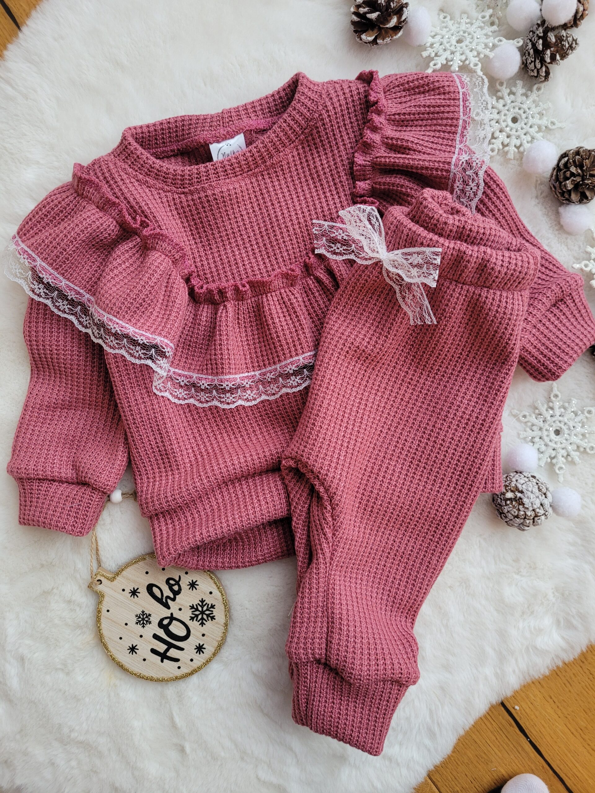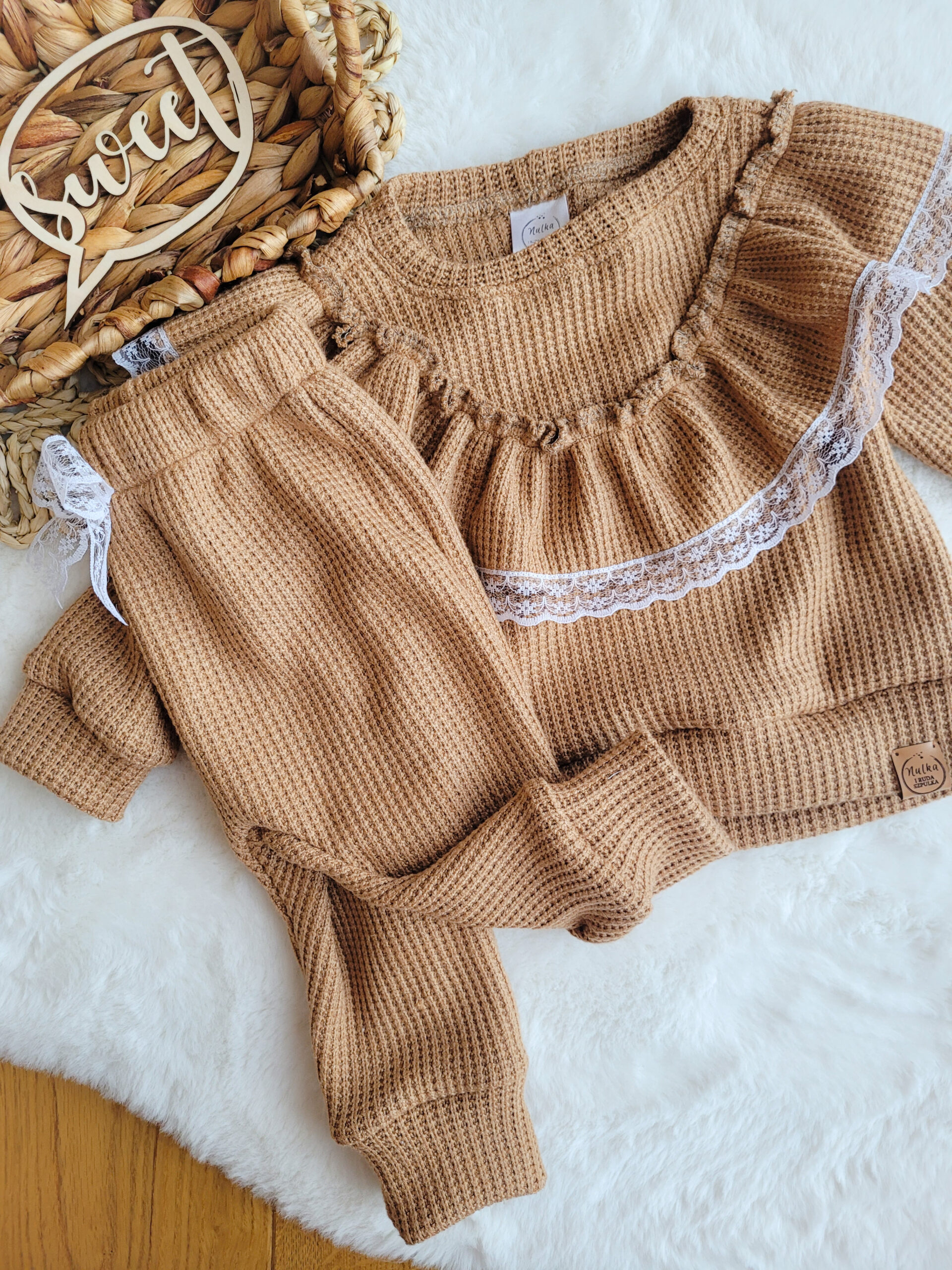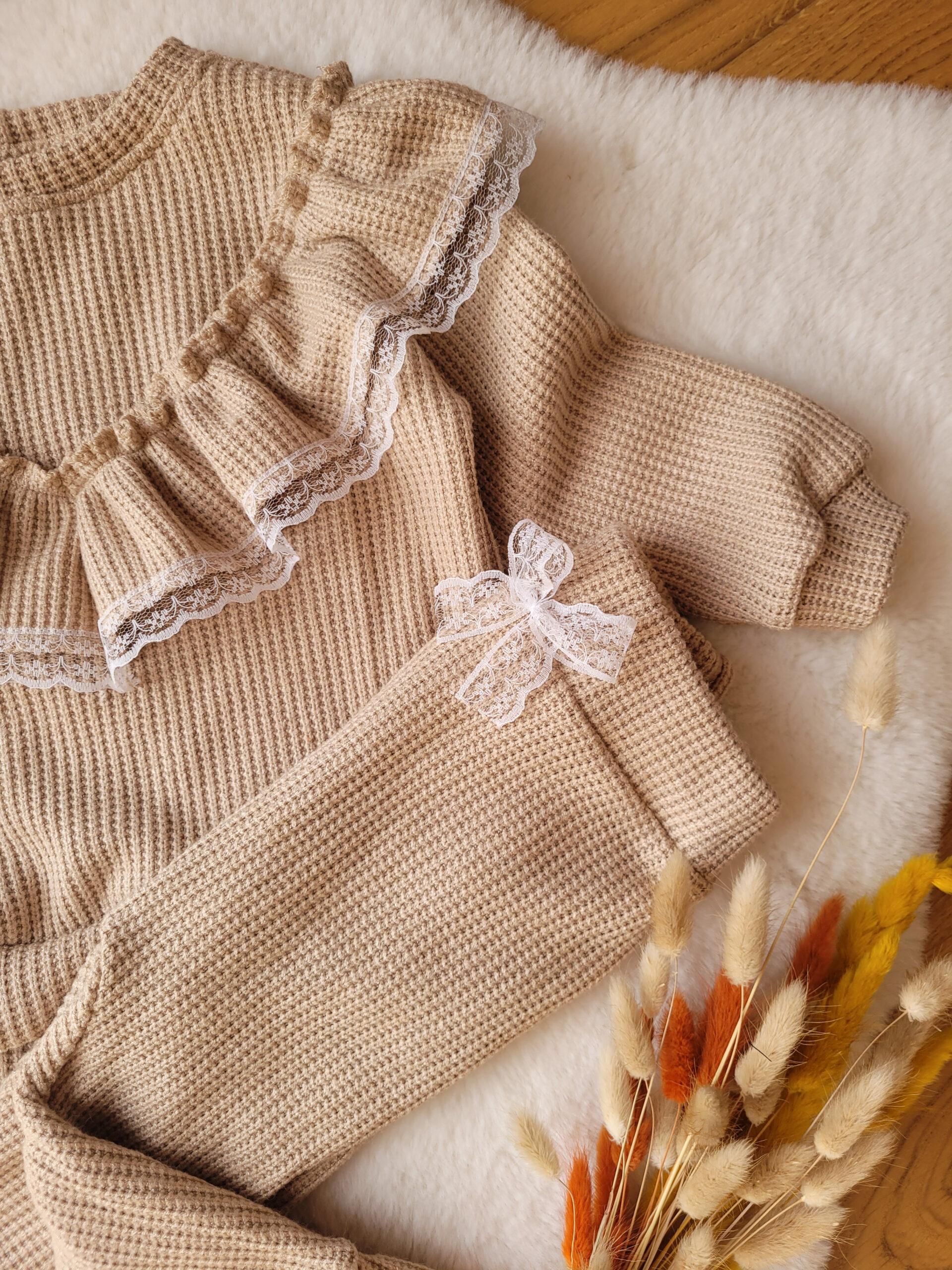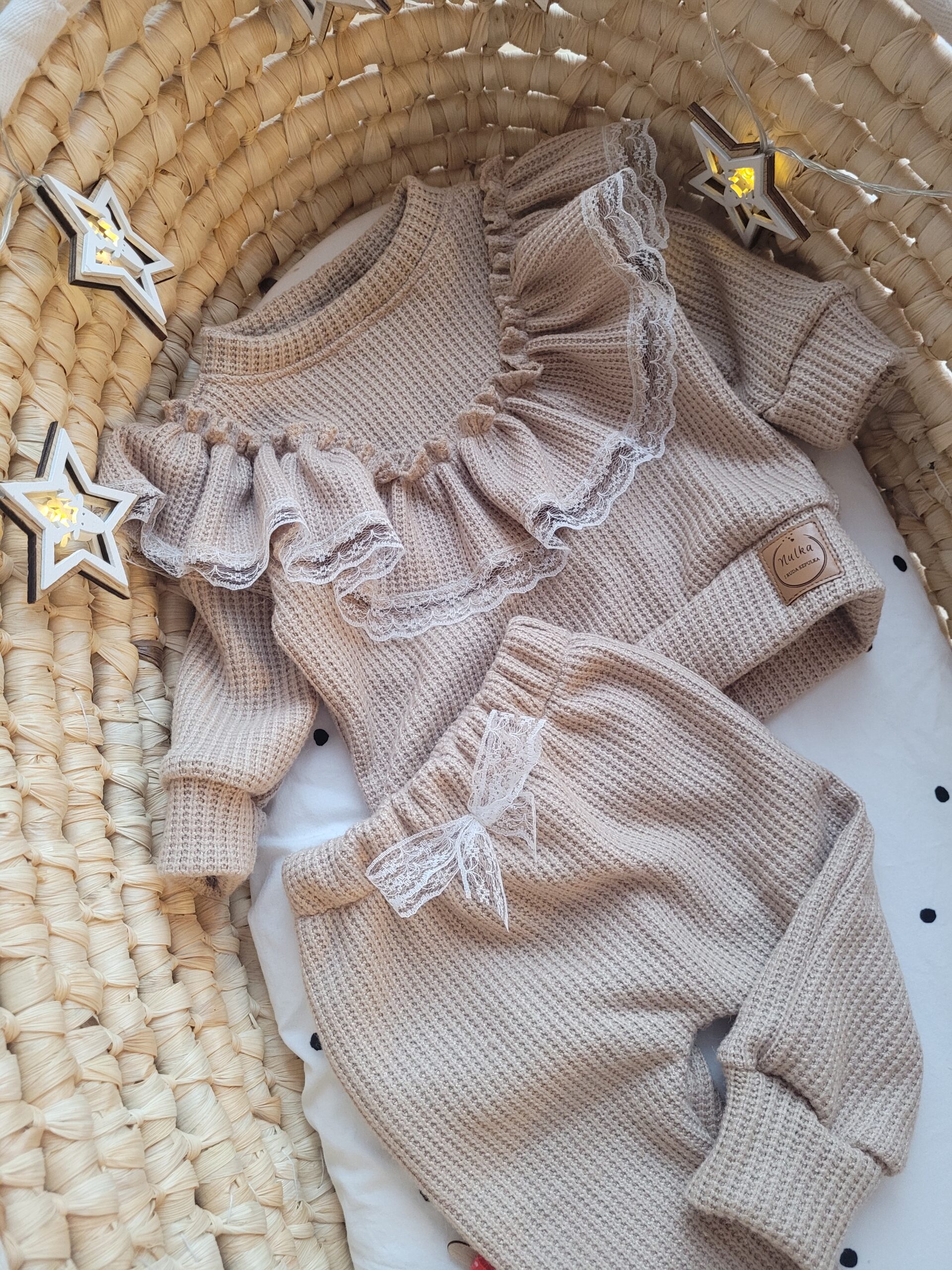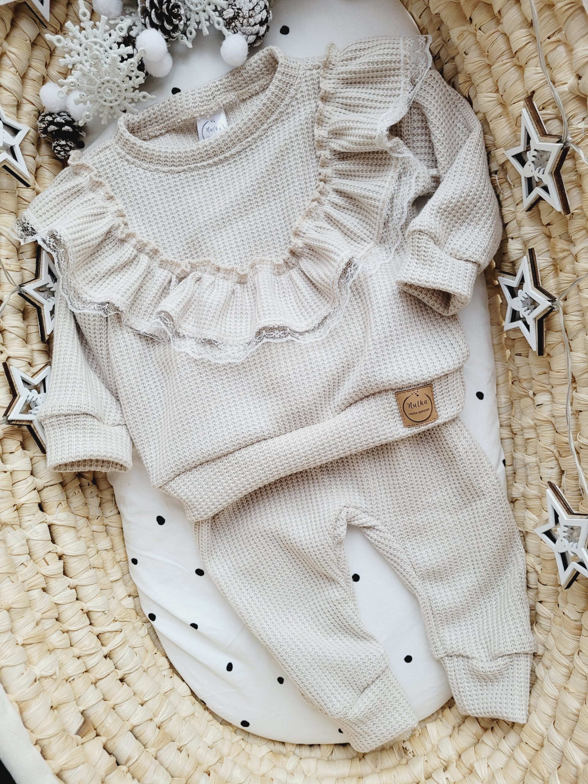 Przepiękny komplet dla dziewczynki uszyty z miękkiej dzianiny sweterkowej, który zawiera sweterek ozdobiony piękną falbanką z koronką oraz pasujące spodnie. Sweterek jest łatwy do założenia przez głowę, co zapewnia wygodę nawet najmłodszym dzieciom. Delikatne, stonowane kolory sprawiają, że będzie idealną ozdobą na wiele stylizacji i okazji, odpowiedni zarówno na jesień, wiosnę jak i zimę. Możesz dowolnie dopasować kolory spodni do wybranego sweterka, w tym warianty z dodatkiem srebrnych nici (błękitny i różowy). Komplet jest dostępny w rozmiarach od 56 do 122.