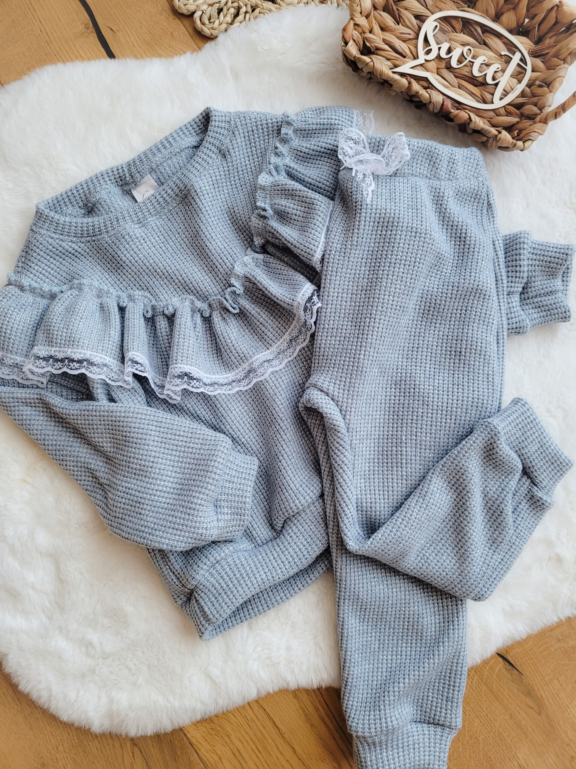 Przepiękny komplet dla dziewczynki uszyty z miękkiej dzianiny sweterkowej, który zawiera sweterek ozdobiony piękną falbanką z koronką oraz pasujące spodnie. Sweterek jest łatwy do założenia przez głowę, co zapewnia wygodę nawet najmłodszym dzieciom. Delikatne, stonowane kolory sprawiają, że będzie idealną ozdobą na wiele stylizacji i okazji, odpowiedni zarówno na jesień, wiosnę jak i zimę. Możesz dowolnie dopasować kolory spodni do wybranego sweterka, w tym warianty z dodatkiem srebrnych nici (błękitny i różowy). Komplet jest dostępny w rozmiarach od 56 do 122.