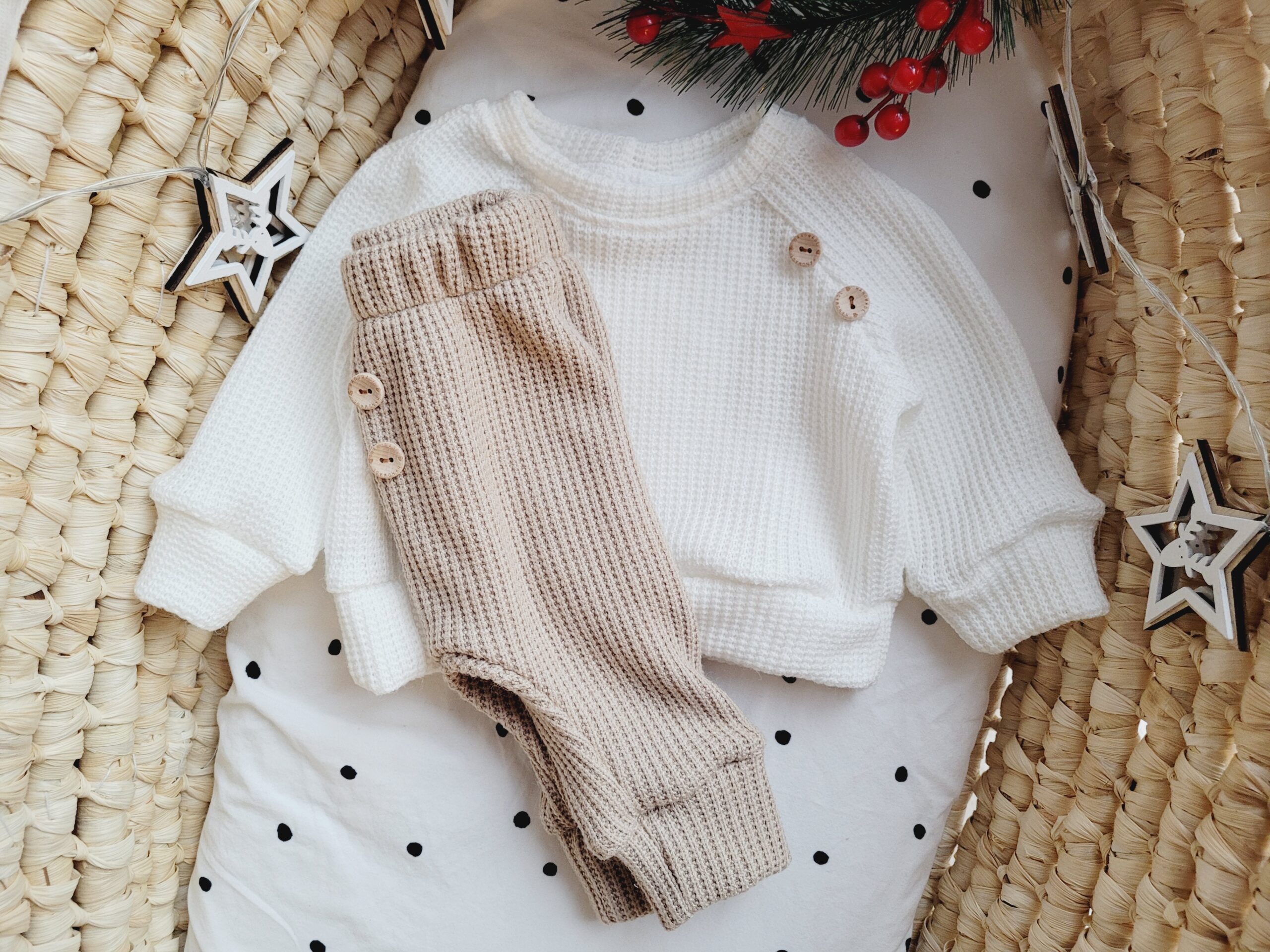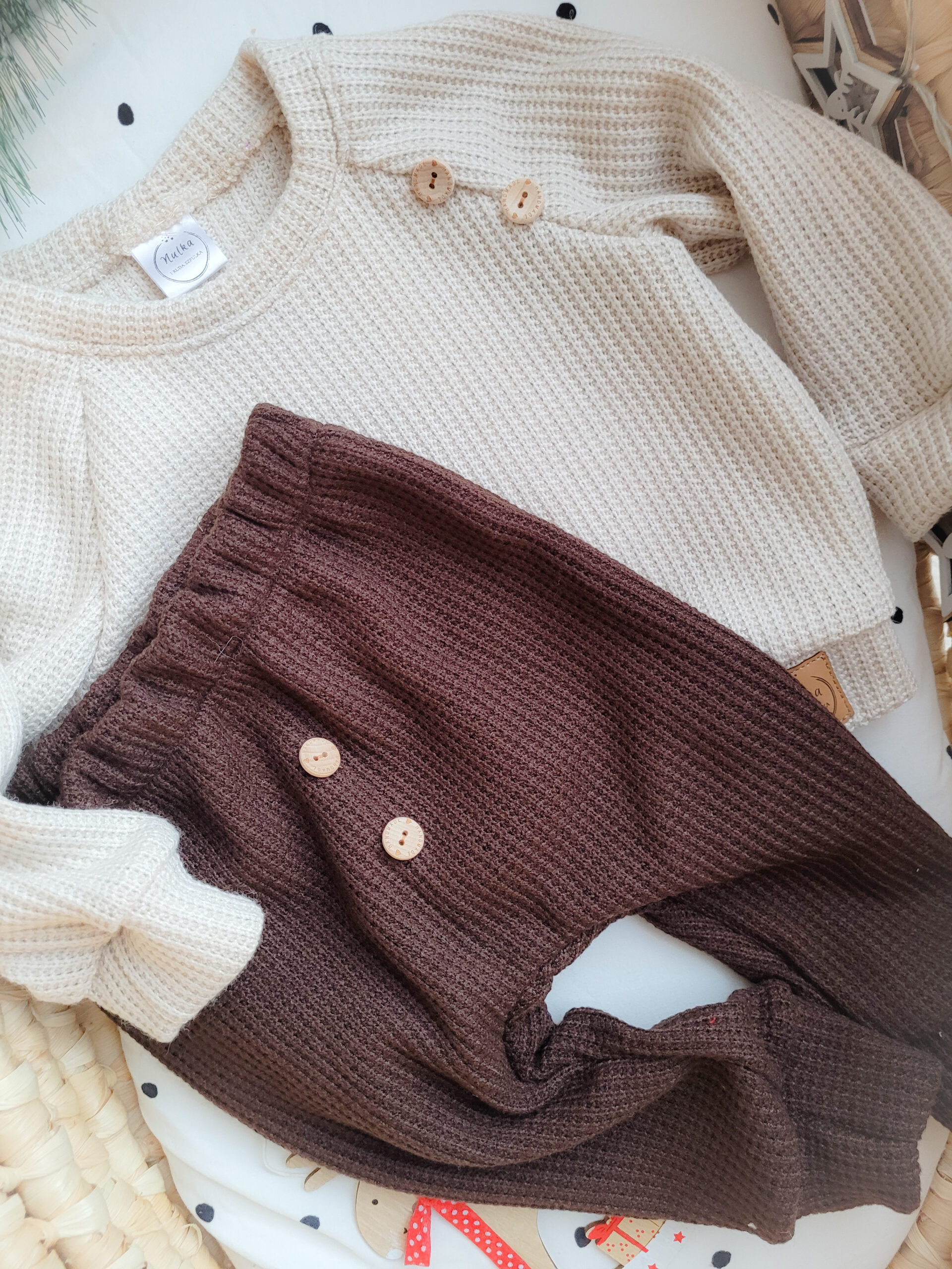Przepiękny komplet dla chłopca lub dziewczynki wykonany z miękkiej dzianiny sweterkowej. Sweterek i spodnie są ozdobione dwoma drewnianymi guzikami, co nadaje im uroku i dodatkowego uroku. Sweterek łatwo nakłada się przez głowę, co sprawia, że jest wygodny nawet dla niemowlaka. Produkt odpowiedni zarówno na jesień i wiosnę, jak i na chłodniejsze dni zimowe.