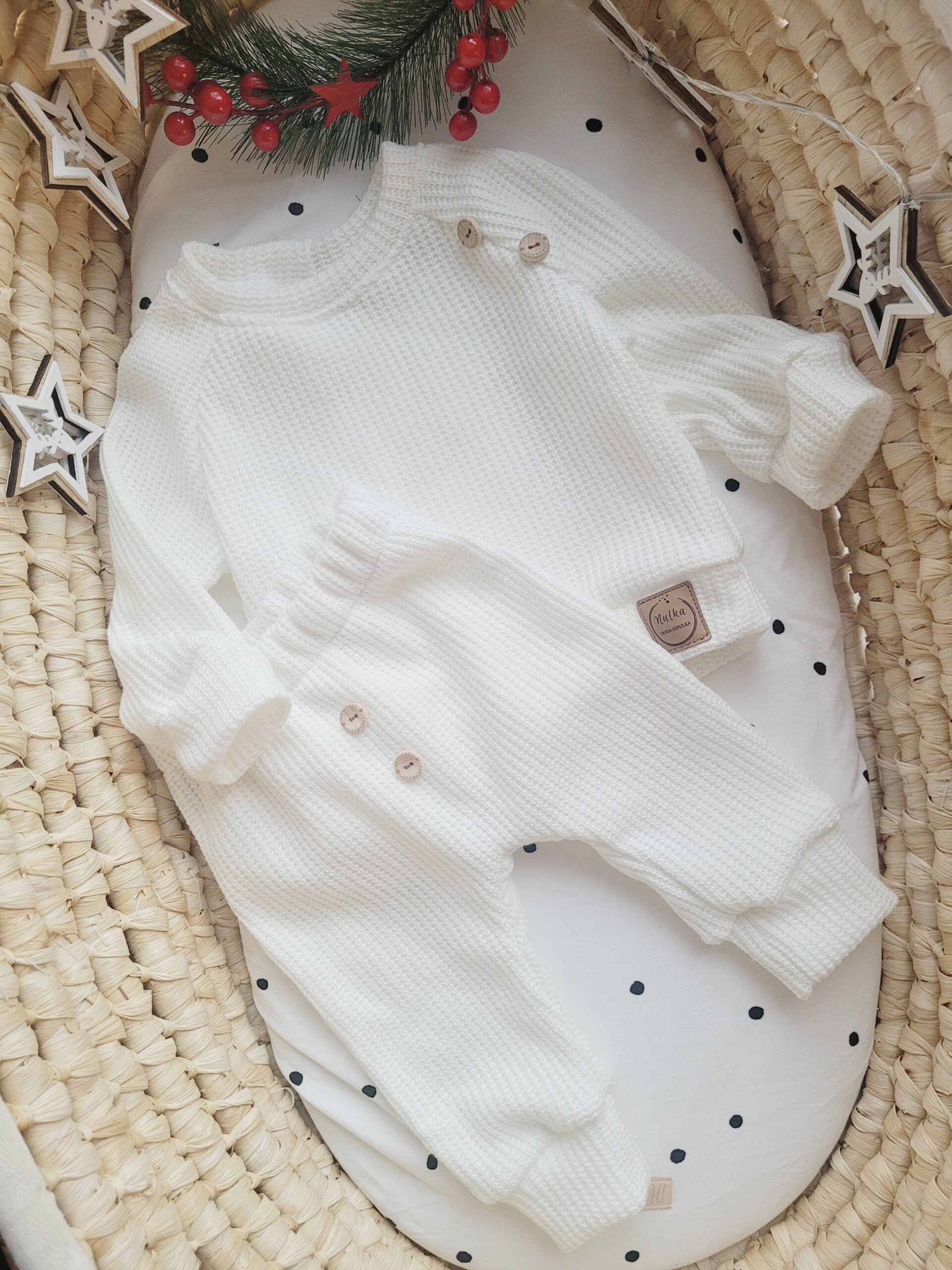 Komplet szyjemy w różnych rozmiarach, dostosowanych do potrzeb noworodków, niemowląt oraz dzieci. Szczegółowe wymiary znajdziesz w tabeli rozmiarów. Dzianina sweterkowa jest miękka, przyjemna w dotyku i nie gryzie, co jest istotne dla delikatnej skóry dziecka.