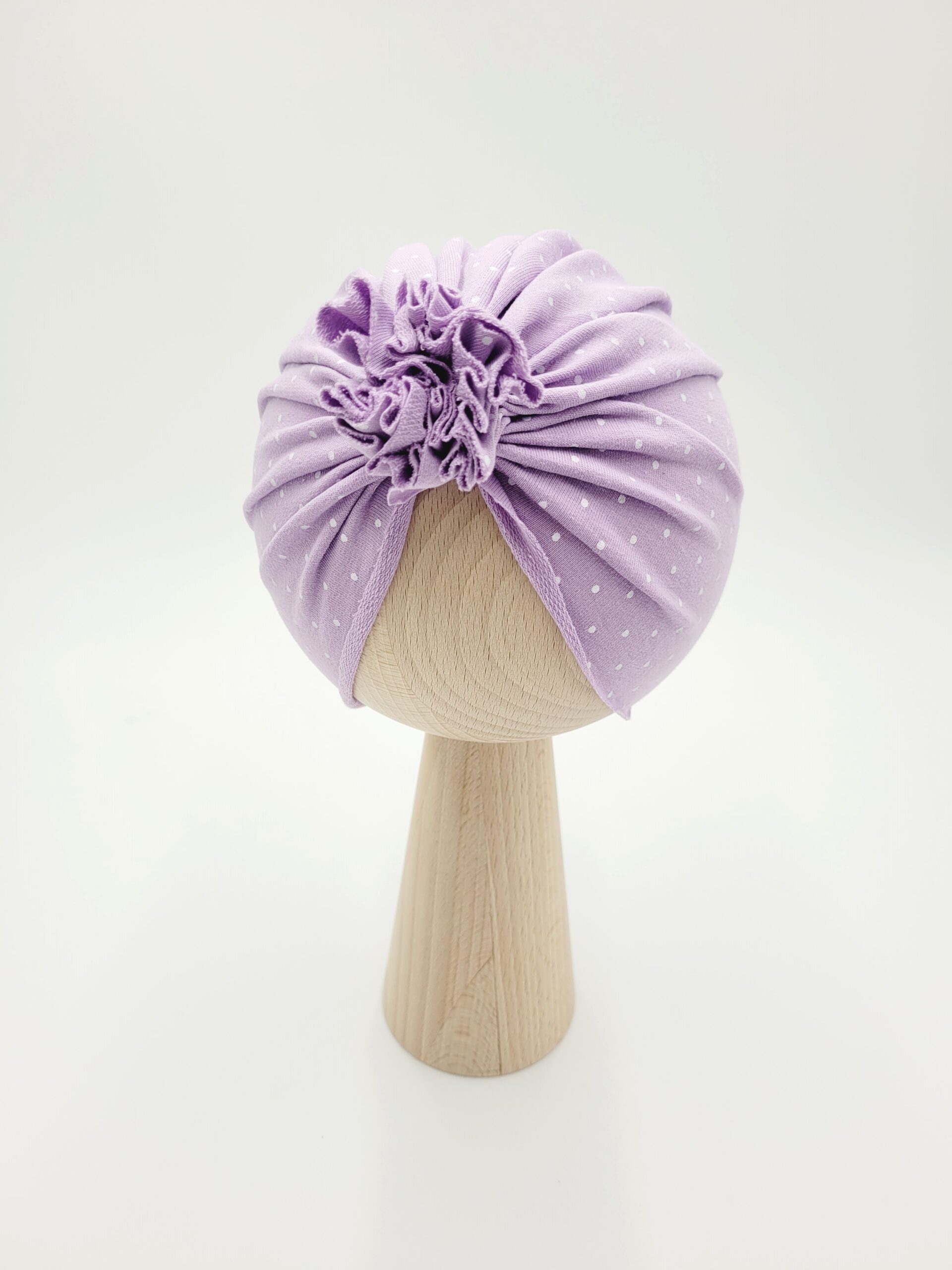 Szukasz wyjątkowego turbanu dla swojej małej księżniczki? Nasz turban w delikatne białe kropeczki będzie idalnym wyborem. Uszyty z pojedynczej lub podwójnej warstwy dzianiny dresowej będzie odpowiedni zarówno na wiosnę i jesień jak i na chłodniejsze letnie dni. Turban szyjemy w rozmiarach dla dzieci i niemowląt.