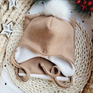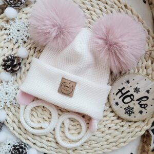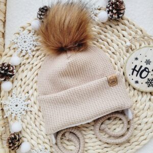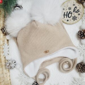 Zimowa czapka wiązana dla chłopca lub dziewczynki ozdobiona jednym lub dwoma pomponami, kolor beżowy lub jasny beż.