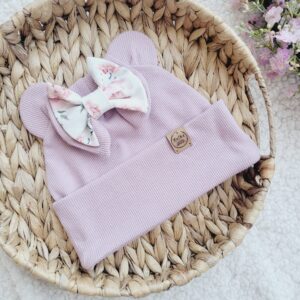 Czapka prążkowana dla dziewczynki ozdobiona misiowymi uszkami i kokardką wzór Purple Garden, piękne perełki na wywinięciu. W wersji zimowej podszyta ciepłym polarem.
