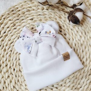 Komplet dla dziewczynki, czapka ozdobiona misiowymi uszkami, kokardką i perełkami w zestawie z chustą z falbanką. Wzór Peony.