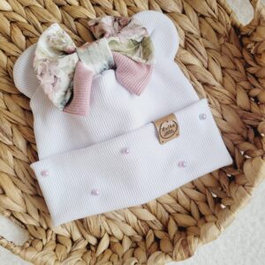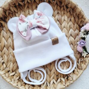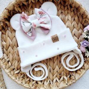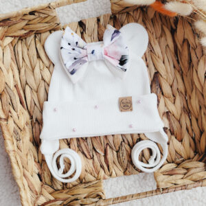 Czapka prążkowana dla dziewczynki ozdobiona misiowymi uszkami i kokardką wzór Peony, piękne perełki na wywinięciu. W wersji zimowej podszyta ciepłym polarem.