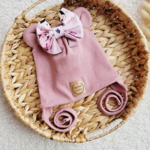 Czapka prążkowana dla dziewczynki ozdobiona misiowymi uszkami i kokardką wzór Dalie, piękne perełki na wywinięciu. W wersji zimowej podszyta ciepłym polarem.