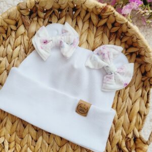 Czapka prążkowana dla dziewczynki ozdobiona misiowymi uszkami i kokardkami wzór biały maczek pastelowy. Dodatkowe perełki i wiązanie.