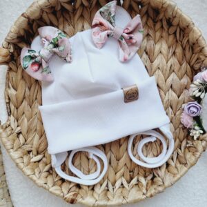 Czapka z uszkami i kokardkami perełki chusta Pastelowe Róże – kolory