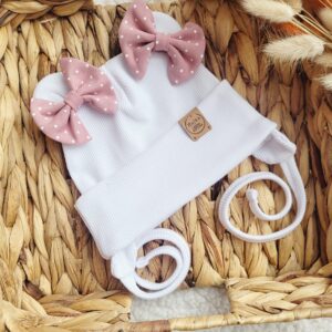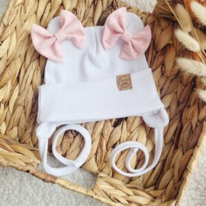• Czapka dla dziewczynki z uszkami i kokardkami Biały Maczek pastelowy róż