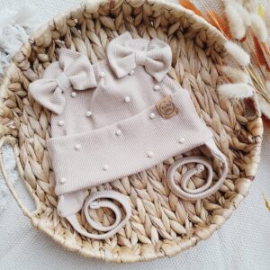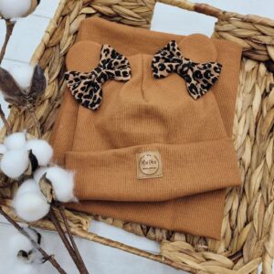 Czapka prążkowana dla dziewczynki ozdobiona misiowymi uszkami i kokardkami Panterka. Możliwe wiązanie i podszycie polarem. Dodatkowo czapkę możemy ozdobić pięknymi perełkami.