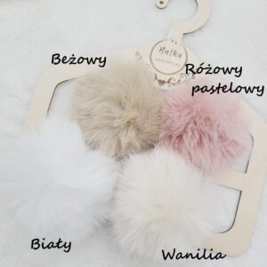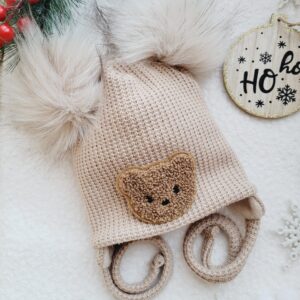 Zimowa czapka wiązana dla dziecka w wybranym kolorze ozdobiona pomponami i naszywką misia.