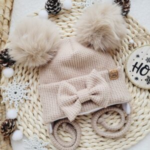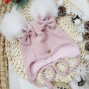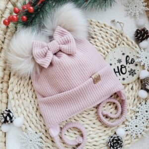 Czapka zimowa dla dziewczynki wiązana z pomponami i kokardką perełki – kolory do wyboru
