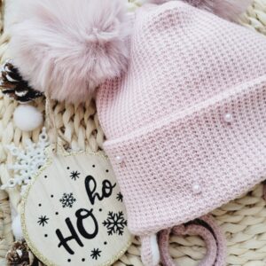Zimowa czapka wiązana dla dziewczynki w wybranym kolorze ozdobiona pomponami, kokardkami i pięknymi perełkami.